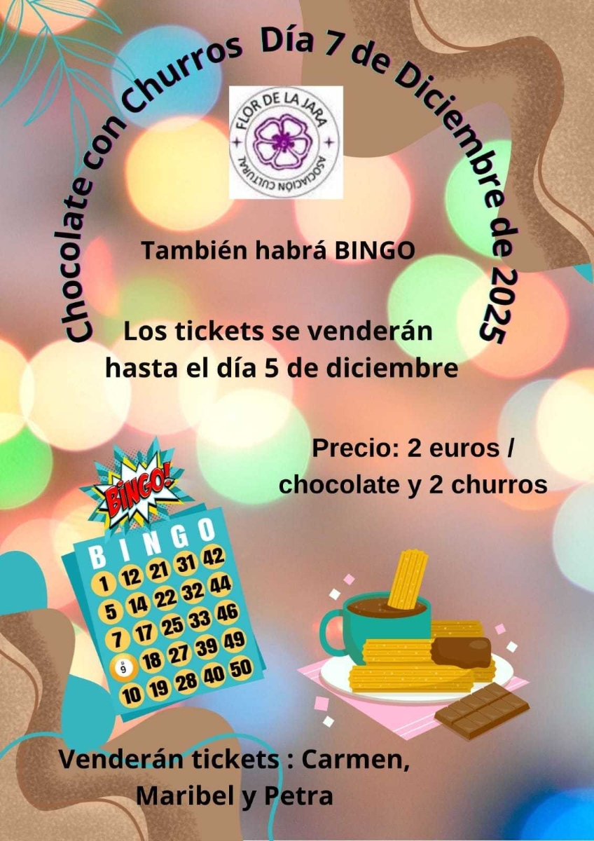 Les recordamos que el próximo 7 de diciembre la Asociación Flor de la Jara, organiza un chocolate con churros en la Sala Multiusos.Se podrán comprar tickets (2€) hasta el 5 de diciembre a PETRA, MARIBEL Y CARMEN.