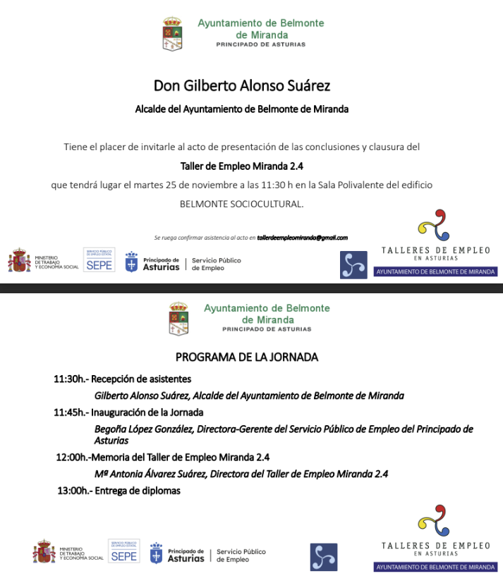 Se invita a los vecinos y vecinas de Belmonte de Miranda al acto de presentación de conclusiones y clausura del Taller de Empelo Miranda 2.4, que tendrá lugar mañana martes 25 de noviembre a las 11:30 horas en el Edificio Sociocultural.