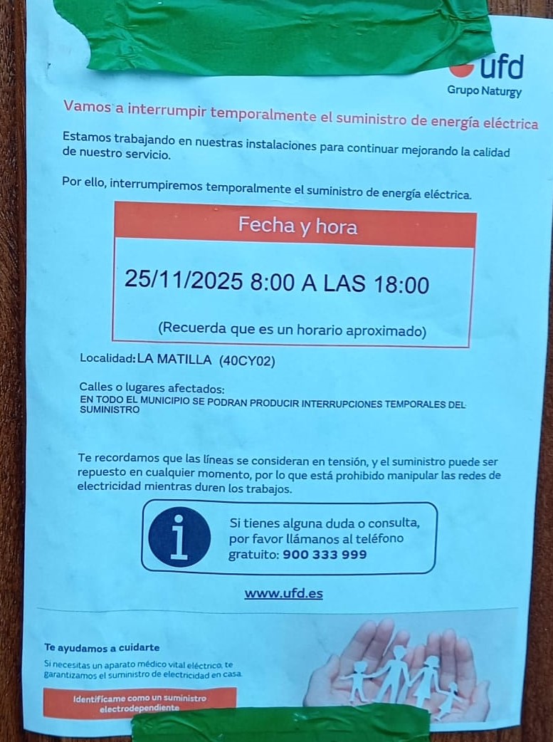 🔌 Durante este intervalo podrá producirse un corte de luz, pero la interrupción NO será superior a 1 hora.
