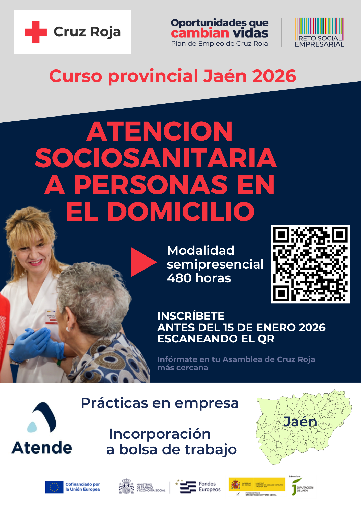 La Cruz Roja pone en marcha el Curso Provincial 2026 de Atención Sociosanitaria a Personas en el Domicilio, una formación semipresencial de 480 horas con prácticas en empresa y posibilidad de incorporación a bolsa de trabajo.