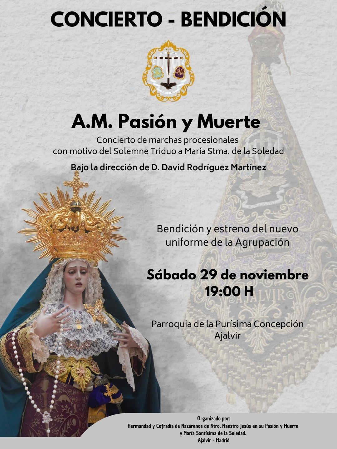El próximo sábado día 29 de noviembre a las 19:00h en la Parroquia de la Purísima Concepción , tendrá lugar el concierto de marchas procesionales con motivo del solemne triduo a Maria Stma de la Soledad bajo la dirección de Dº David Rodriguez Martínez .