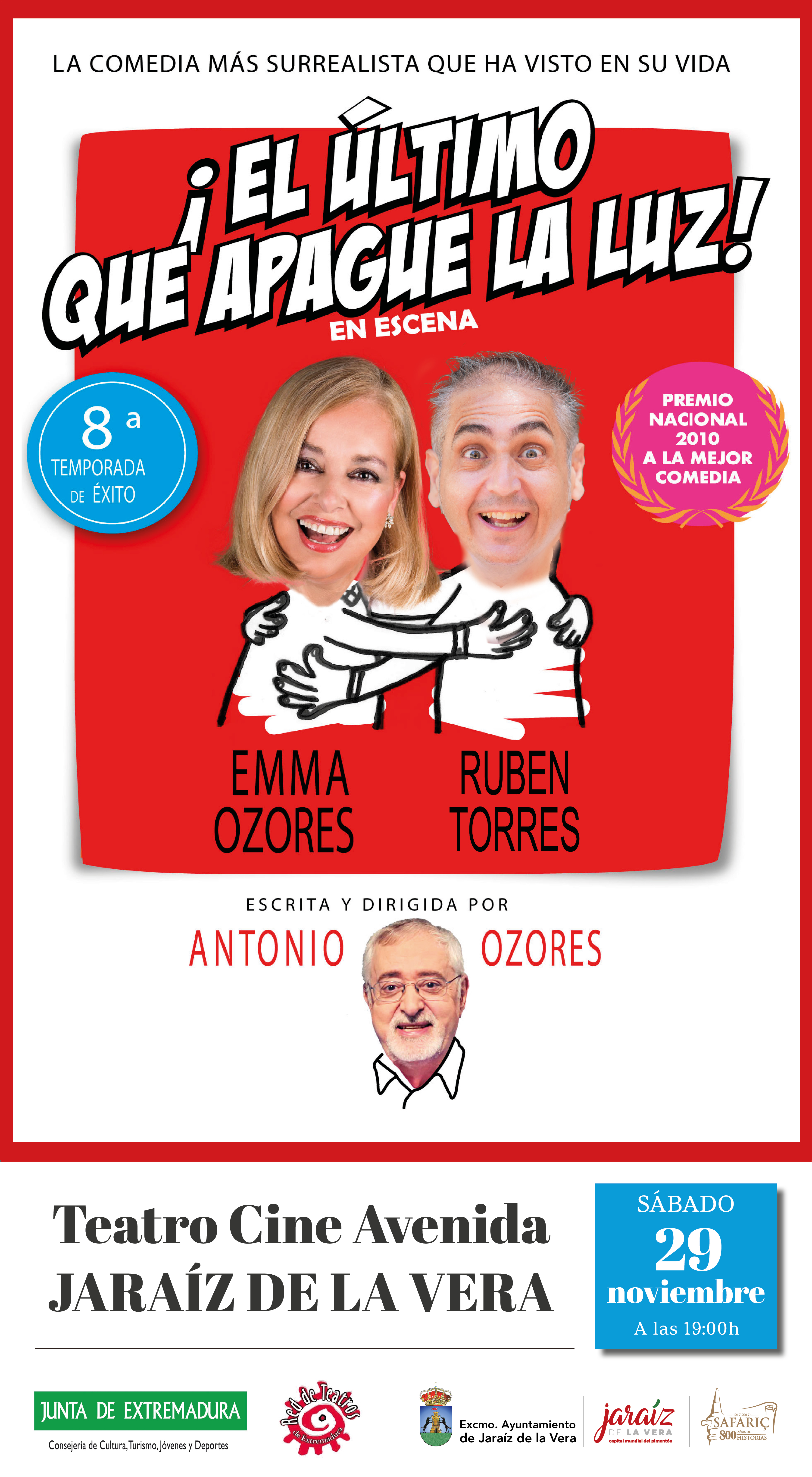 El Ayuntamiento de Jaraíz de la Vera informa que, este sábado 29 de noviembre a las 19:00 horas, el Teatro Cine Avenida acogerá la obra de teatro “El último que apague la luz”.