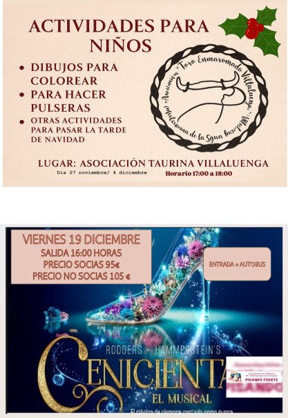 - La Asociación de Mujeres “Pisando Fuerte” ha preparado una actividad (salida a Madrid/Musical) de cara a Navidad, en día 19 de diciembre, para que se apunte el público en general.