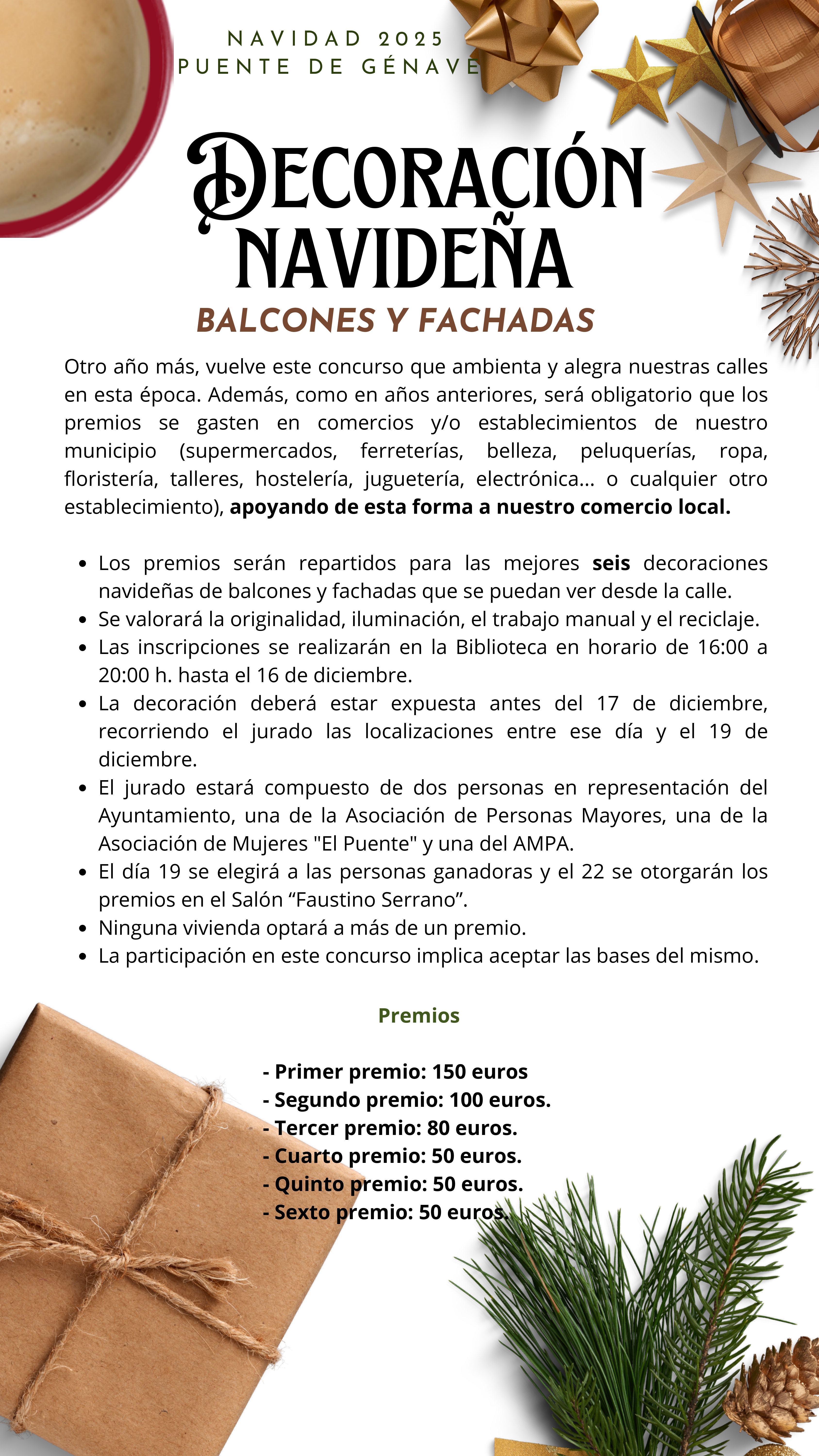 -Los premios serán repartidos para las mejores seis decoraciones navideñas de balcones y fachadas que se puedan ver desde la calle.-Se valorará la originalidad, iluminación, el trabajo manual y el reciclaje.-Las inscripciones se realizarán en la Biblioteca (Punto Vuela)-La decoración deberá estar expuesta antes del 17 de diciembre, recorriendo el jurado las localizaciones entre ese día y el 19 de diciembre.-El jurado estará compuesto de dos personas en representación del Ayuntamiento, una de la Asociación de Personas Mayores, una de la Asociación de Mujeres "El Puente" y una del AMPA.-El día 19 se elegirá a las personas ganadoras y el 22 se otorgarán los premios en el Salón "Faustino Serrano". (suceptible a cambios de feh-Ninguna vivienda optará a más de un premio.-La participación en este concurso implica aceptar las bases del mismo.