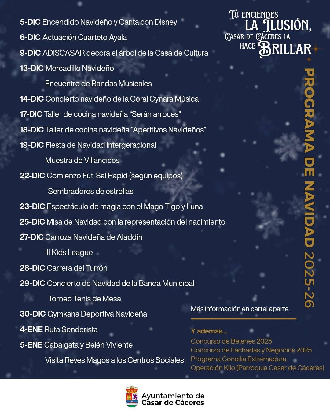✅Este año, bajo el lema “Tú enciendes la ilusión, Casar de Cáceres la hace brillar”, presentamos una programación llena de música, talleres, deporte, espectáculos y tradición para disfrutar en familia.