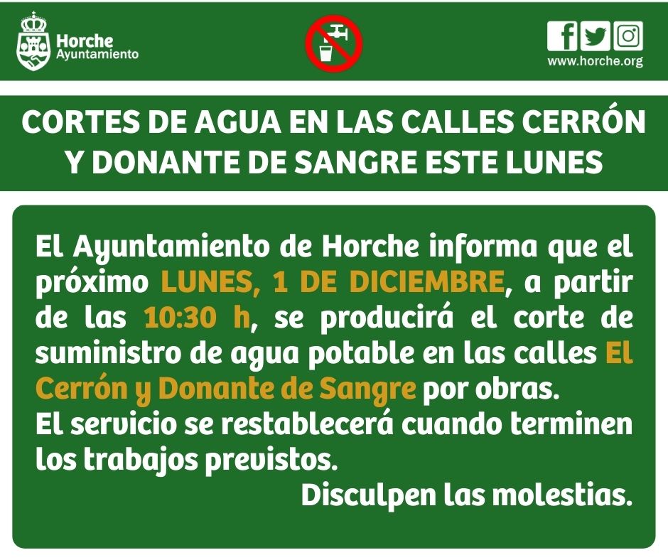 El Ayuntamiento de Horche informa que el próximo LUNES, 1 DE DICIEMBRE, a partir de las 10:30 h, se producirá el corte de suministro de agua potable en las calles El Cerrón y Donante de Sangre por obras.