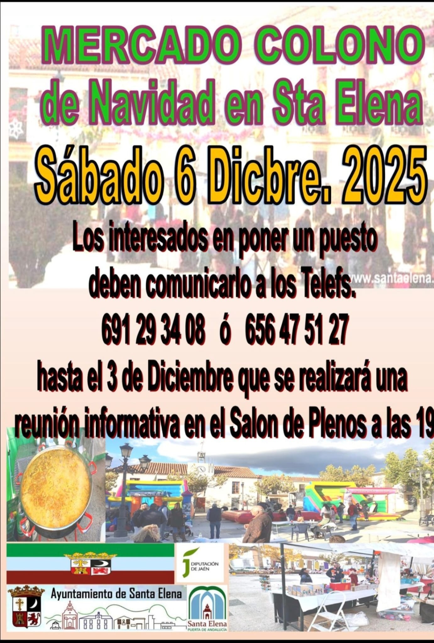 Hasta el día 3 de Diciembre está abierto el plazo para solicitar un puesto en el Mercado Colono de Navidad de Santa Elena, que se celebrará el Sábado día 6 de Diciembre en la Plaza de la Constitución.