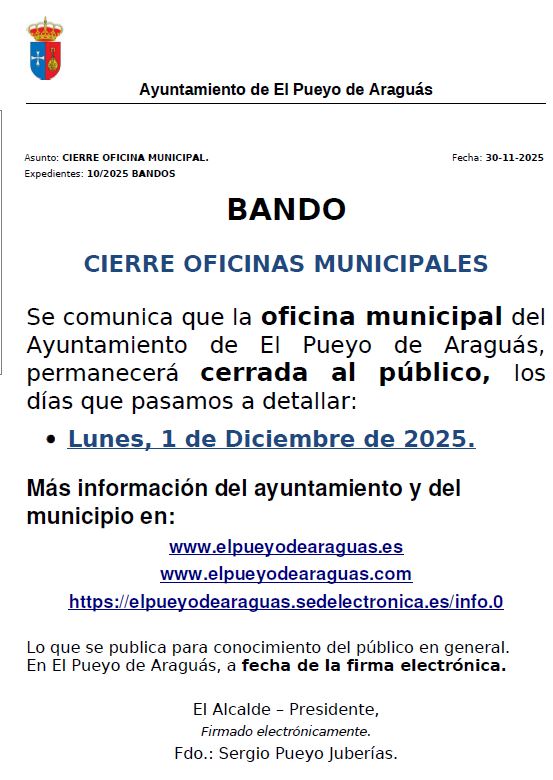 📌Se comunica que la oficina municipal del Ayuntamiento de El Pueyo de Araguás, permanecerá cerrada al público, el día que pasamos a detallar: