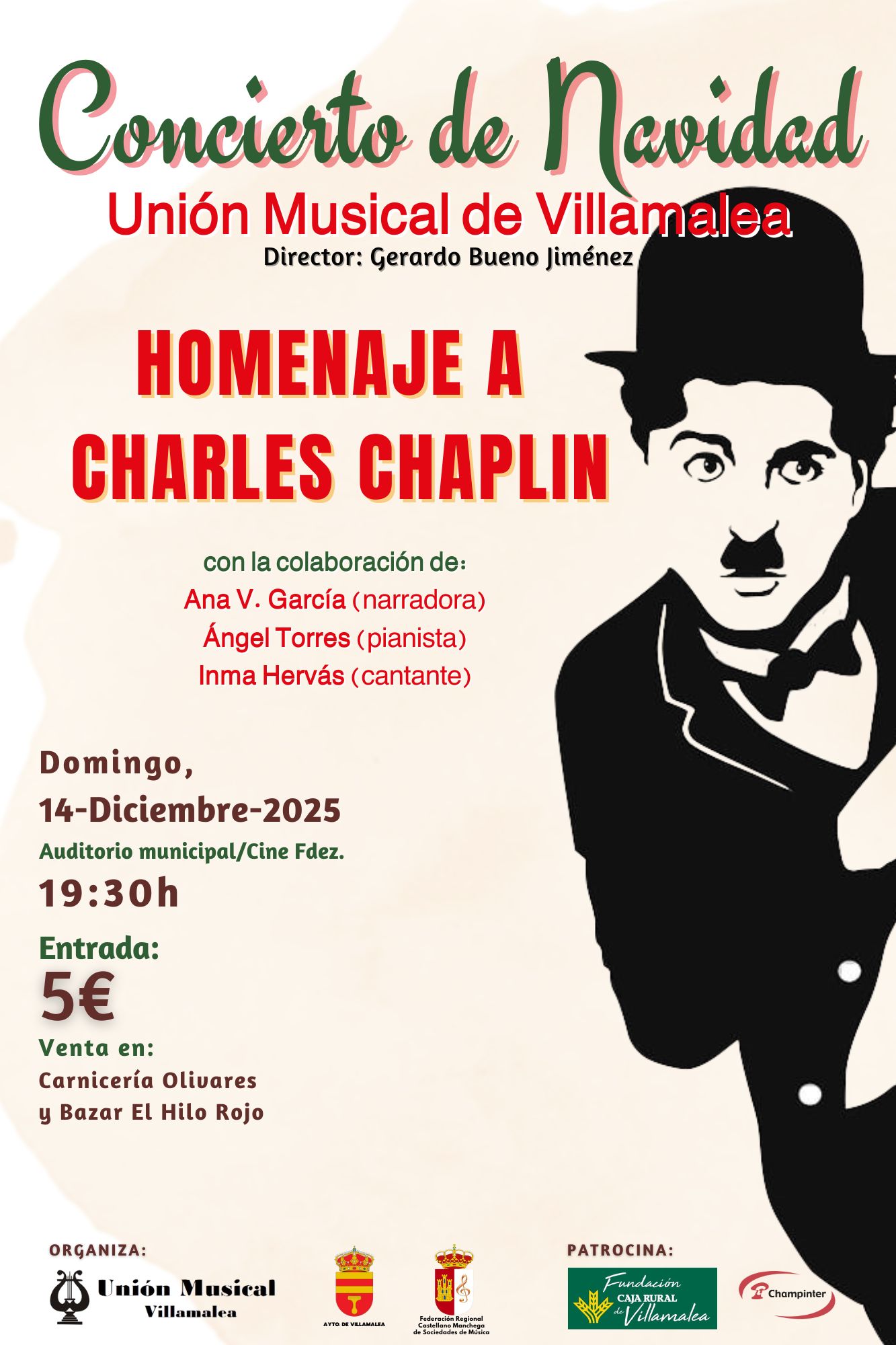 ๐ฟ๐๐๐พ๐๐๐๐พ๐๐ฬ๐: Gran concierto de Navidad a cargo de la Uniรณn Musical de Villamalea, con un magnรญfico repertorio homenajeando al gran Chales Chaplin, con la colaboraciรณn de Ana V. Garcรญa (narradora), รngel Torres (pianista) e Inma Hervรกs (cantante) junto con las proyecciรณn de las mejores y mรกs representativas imรกgenes de โCharlotโ.