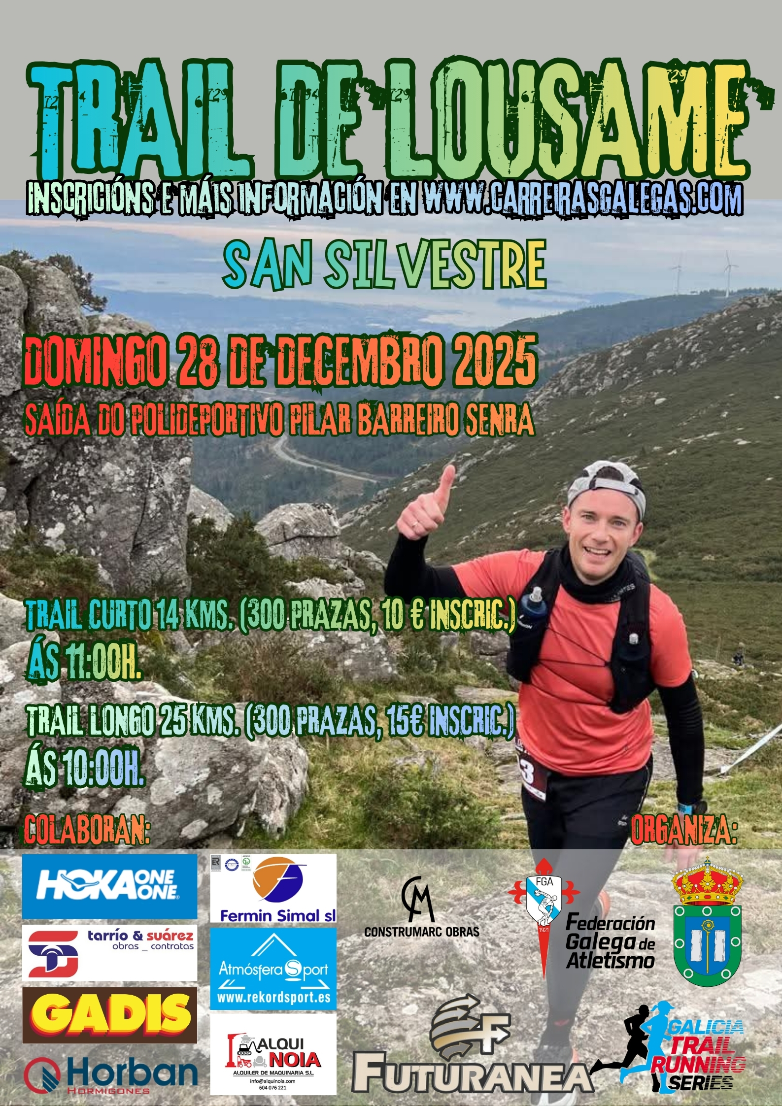 O 𝗧𝗿𝗮𝗶𝗹 𝗱𝗲 𝗟𝗼𝘂𝘀𝗮𝗺𝗲 terá lugar o 𝗱𝗼𝗺𝗶𝗻𝗴𝗼 𝟮𝟴 𝗱𝗲 𝗱𝗲𝗰𝗲𝗺𝗯𝗿𝗼 (non che é inocentada ningunha), a partir das 10:00 horas. Haberá 600 prazas: 300 para o longo (25 km / 15€) e 300 para o curto (14 km / 10€). O mesmo trazado do ano pasado, con saída e meta no polideportivo da Silva e unha espectacular subida ao monte Muralla.