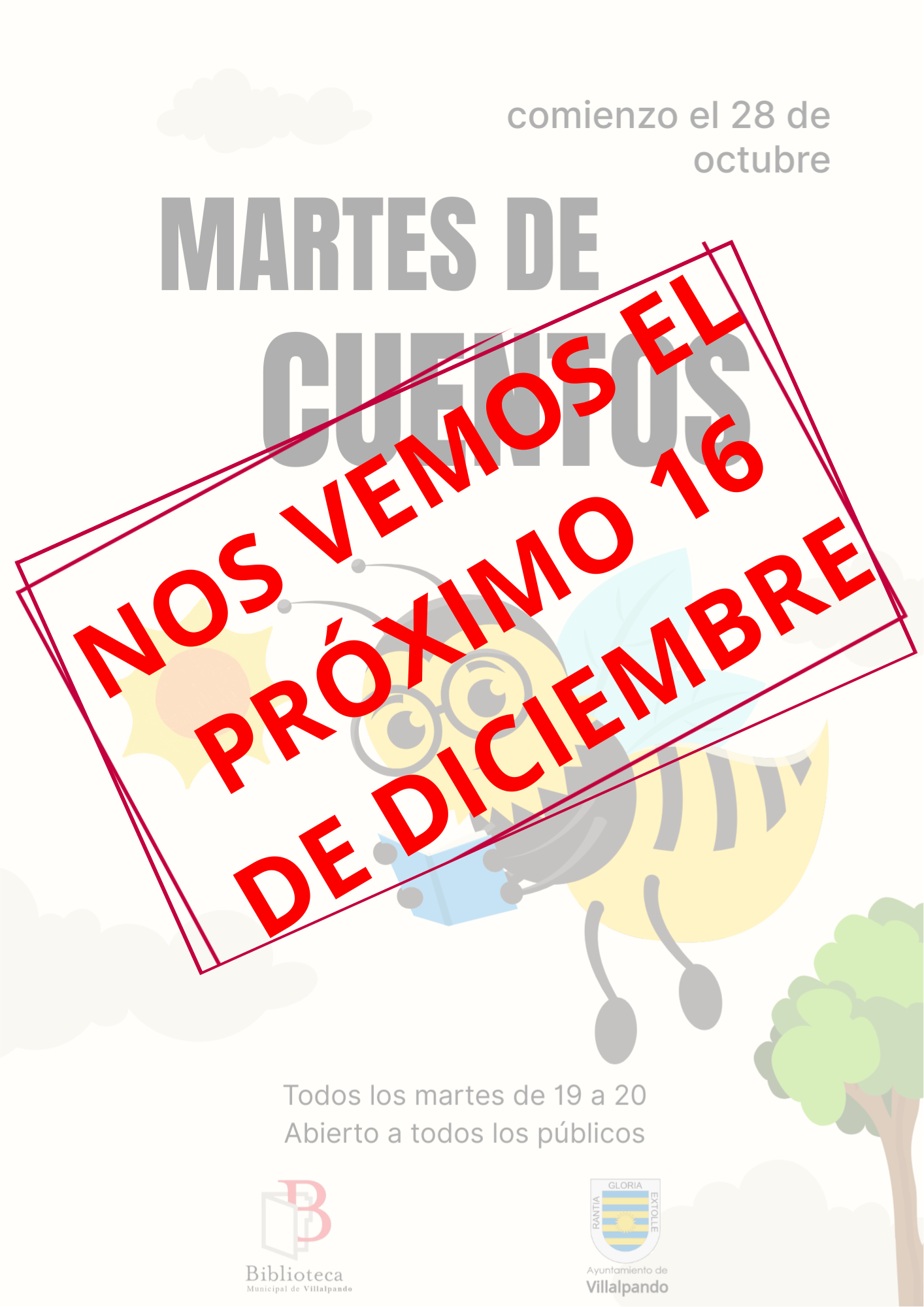 Por necesidades de cambio de horarios, no habrĂ¡ cuentacuentos en la biblioteca ni este martes 2 ni el que viene 9 de diciembre. La actividad regresa el martes 16 de diciembre a las 19:00.