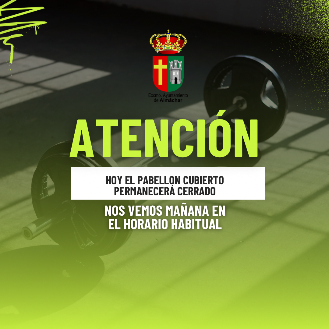 📢 AVISO IMPORTANTE Informamos a todos los vecinos y vecinas que el pabellón cubierto permanecerá cerrado durante el día de hoy. 🙏 Rogamos disculpen las molestias y agradecemos su comprensión.