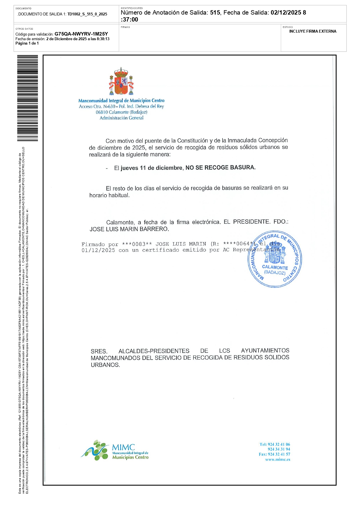 Se informa que con motivo del próximo día festivo, el jueves (11 de diciembre), NO se realizará el servicio de recogida de basura.