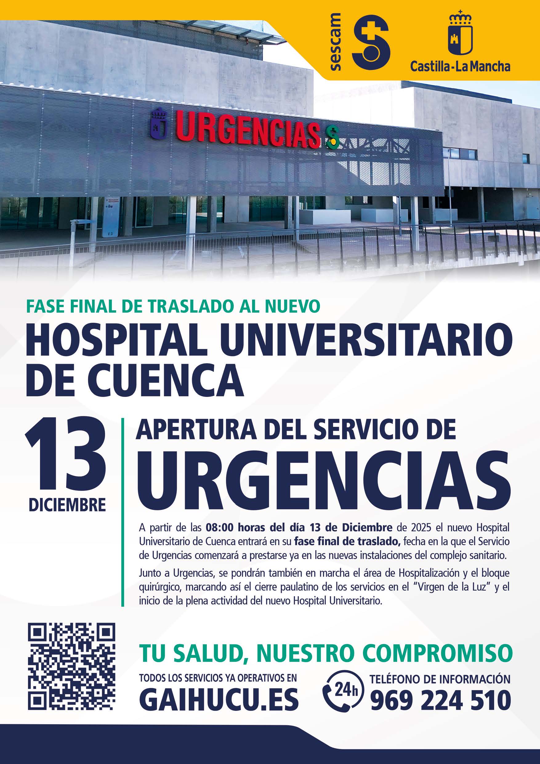A partir de las 08:00 h del sábado, 13 de diciembre de 2025, el nuevo Hospital Universitario de Cuenca entrará en su fase final de traslado. En esa fecha, el Servicio de Urgencias de Cuenca comenzará a prestarse en las nuevas instalaciones del complejo sanitario.