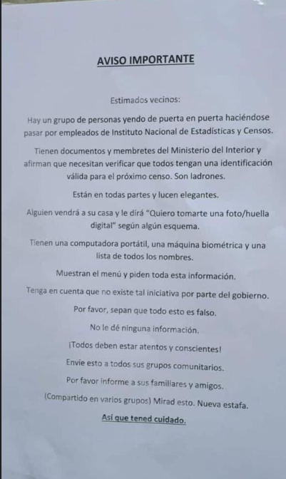 Se informa a todos los vecinos y vecinas que se está difundiendo un aviso sobre un supuesto grupo de personas que va puerta por puerta haciéndose pasar por empleados del Instituto Nacional de Estadística y Censos.