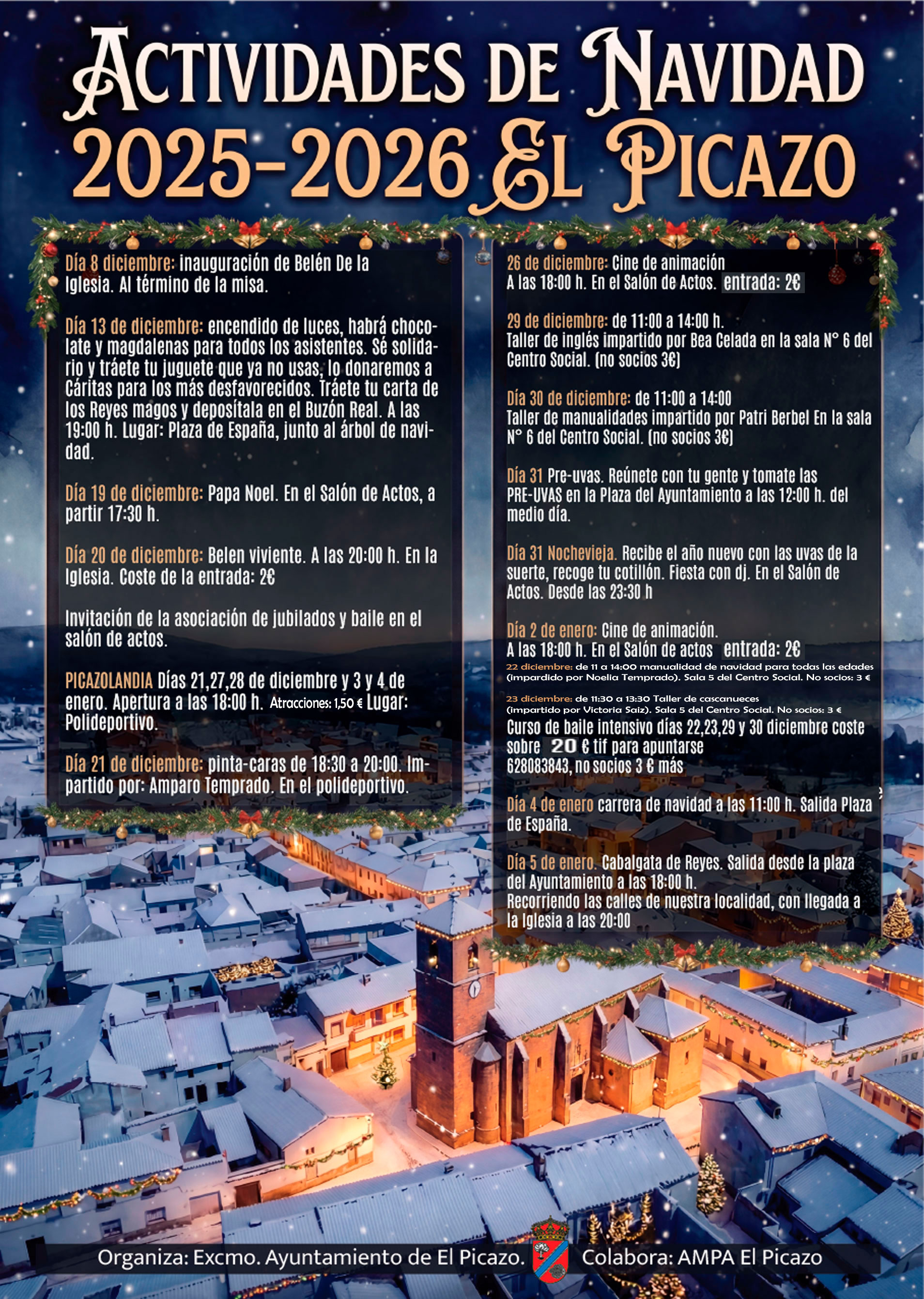 PICAZOLANDIA: Días 21, 27, 28 de diciembre y 3 y 4 de enero. Lugar: Polideportivo, apertura a las 18:00 h. Precio atracciones: 1,5 €
