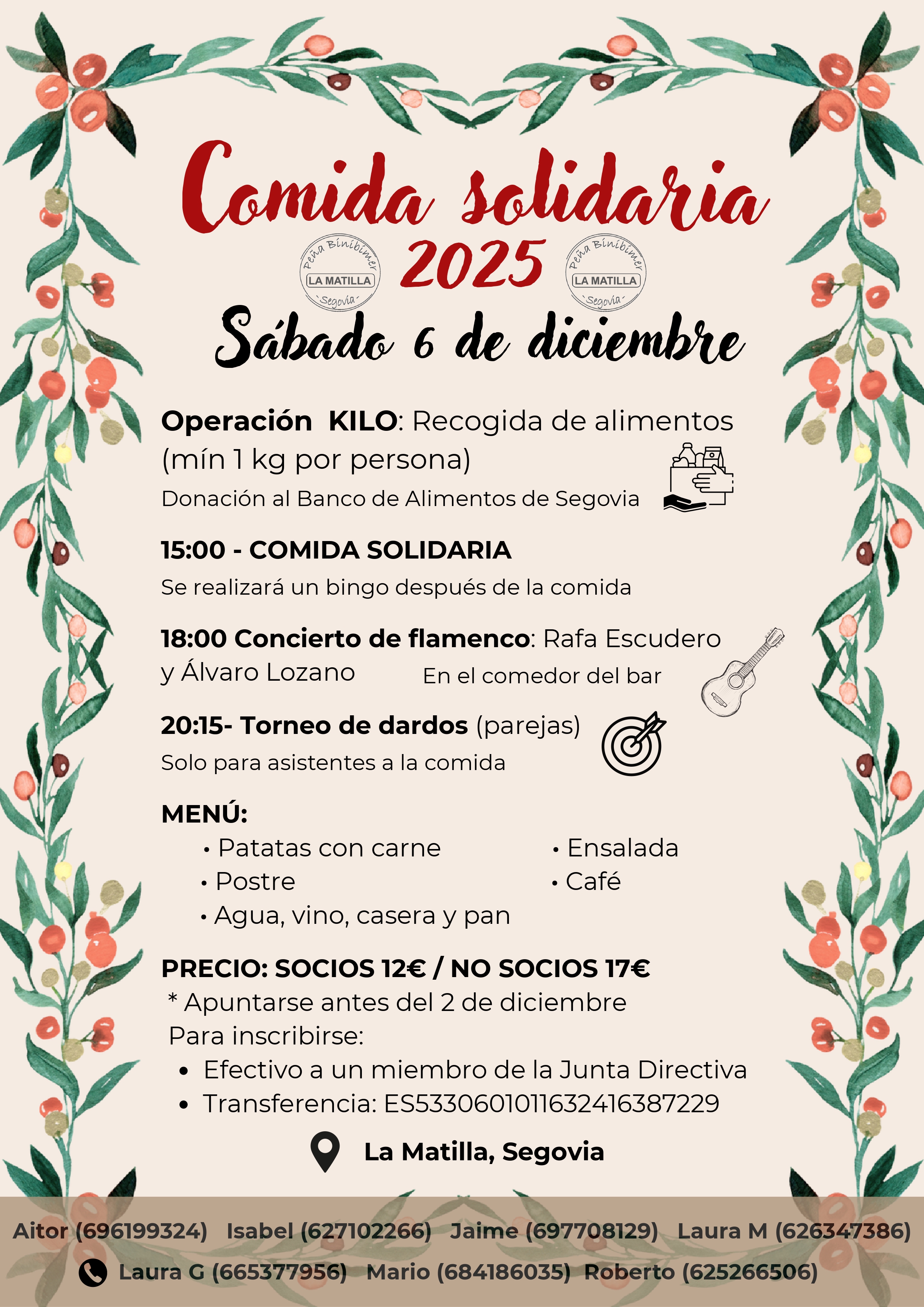 Les recordamos que este sábado 6 de diciembre celebramos un año más la Comida Solidaria 2025, organizada para apoyar al Banco de Alimentos de Segovia.