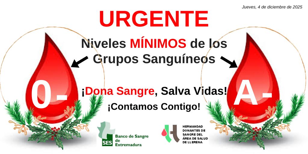 NIVELES MÍNIMOS DE LOS GRUPOS SANGUÍNEOS A- Y 0-. SE PUEDE DONAR EN EL HOSPITAL DE LLERENA O EN EL DE ZAFRA DE 9:00 A 14:00 HORAS.¡DONAR SANGRE, SALVA VIDAS!