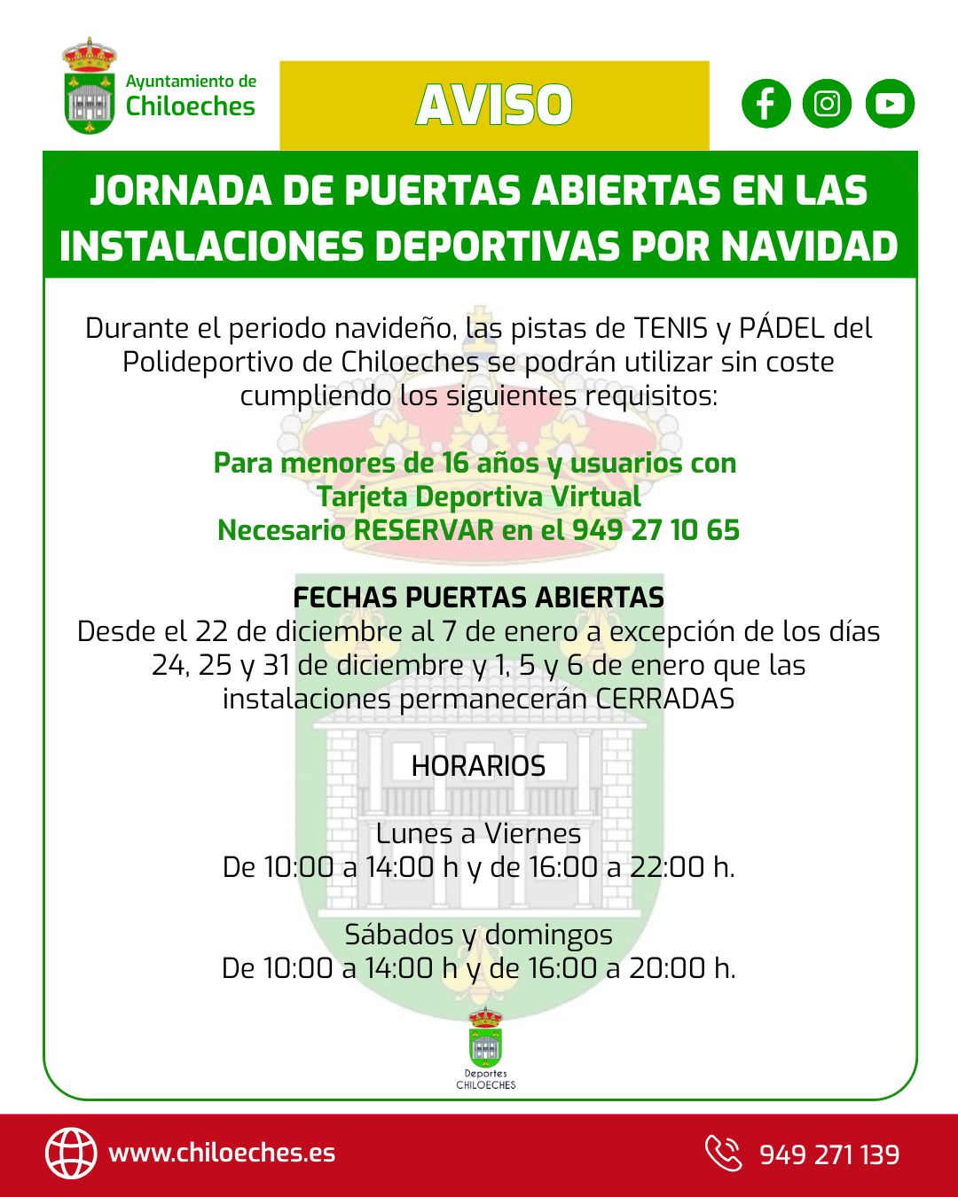 Desde el 22 de diciembre al 7 de enero, a excepción de los días 24, 25 y 31 de diciembre y 1, 5 y 6 de enero que las instalaciones permanecerán CERRADAS.