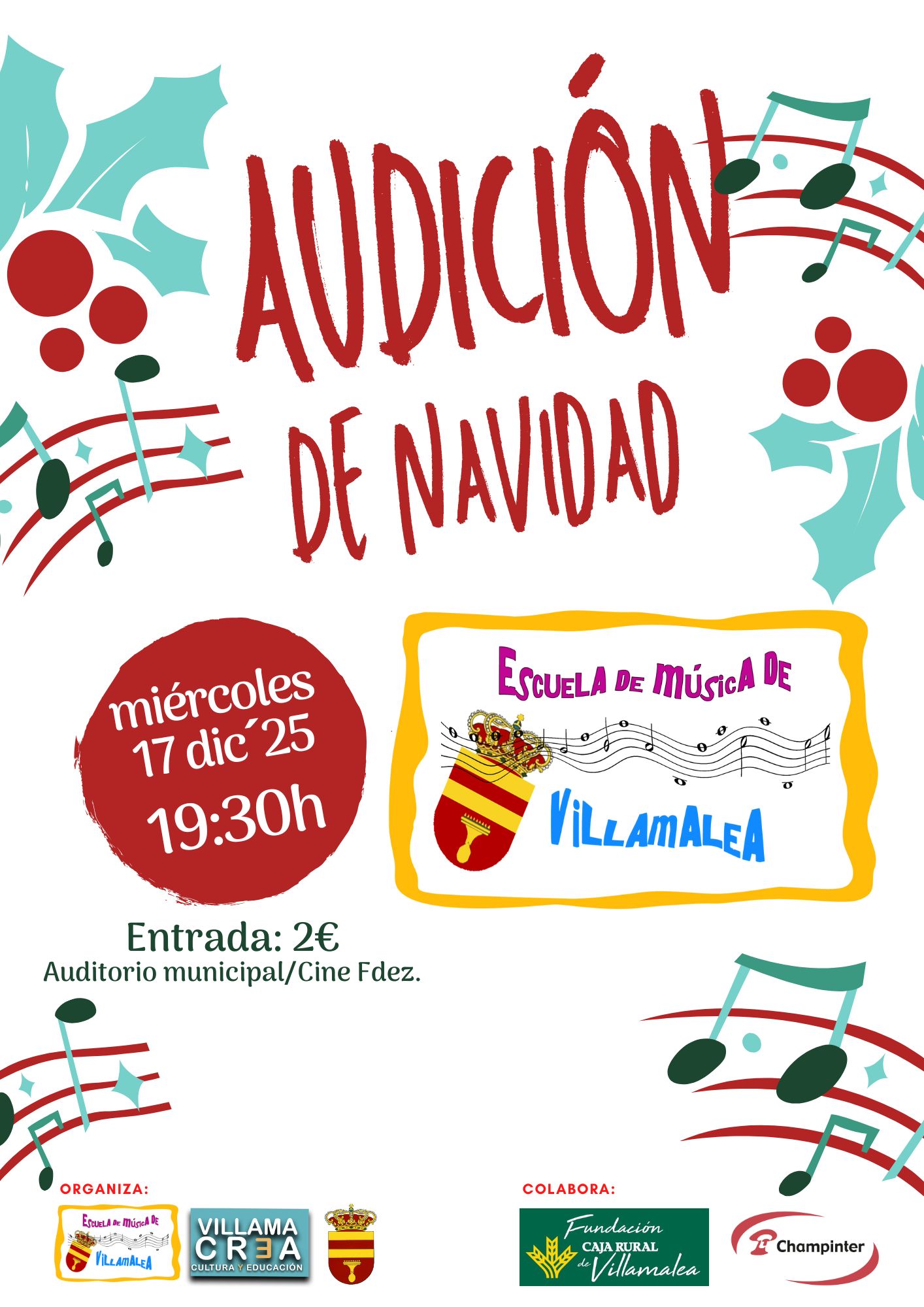 ๐ฟ๐๐๐พ๐๐๐๐พ๐๐ฬ๐: Audiciรณn de Navidad con la participaciรณn de las diferentes especialidades instrumentales y vocales de la Escuela Municipal de Mรบsica de Villamalea.