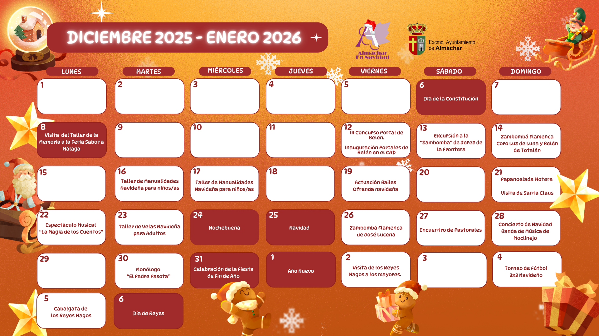 🎄✨ Llega el puente y es hora de prepararse para la Navidad: decorar la casa, montar el árbol, colocar el belén… y, por supuesto, cargar pilas para todas las actividades que desde el Ayuntamiento de Almáchar os hemos preparado.
