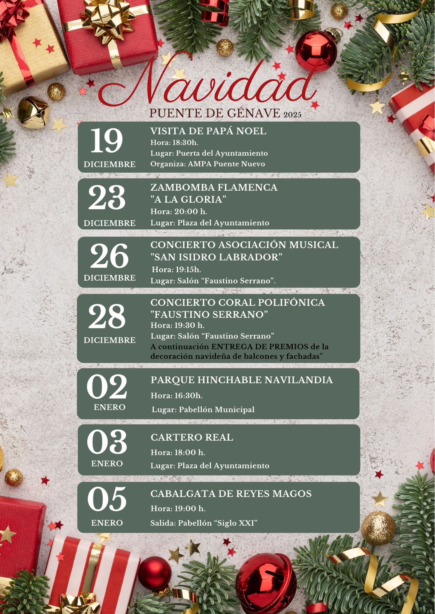 Desde el Ayuntamiento, hemos preparado con gran ilusión y cariño esta programación, pensando en todas las edades, desde el tradicional Concierto de la Banda de Música Asociación Musical San Isidro Labrador de Puente de Génave, la Coral "Faustino Serrano" 🎺 y la Zambomba Flamenca 💃, hasta la esperada visita de Papá Noel 🎅 y, por supuesto, la mágica Cabalgata de Sus Majestades los Reyes Magos de Oriente 👑