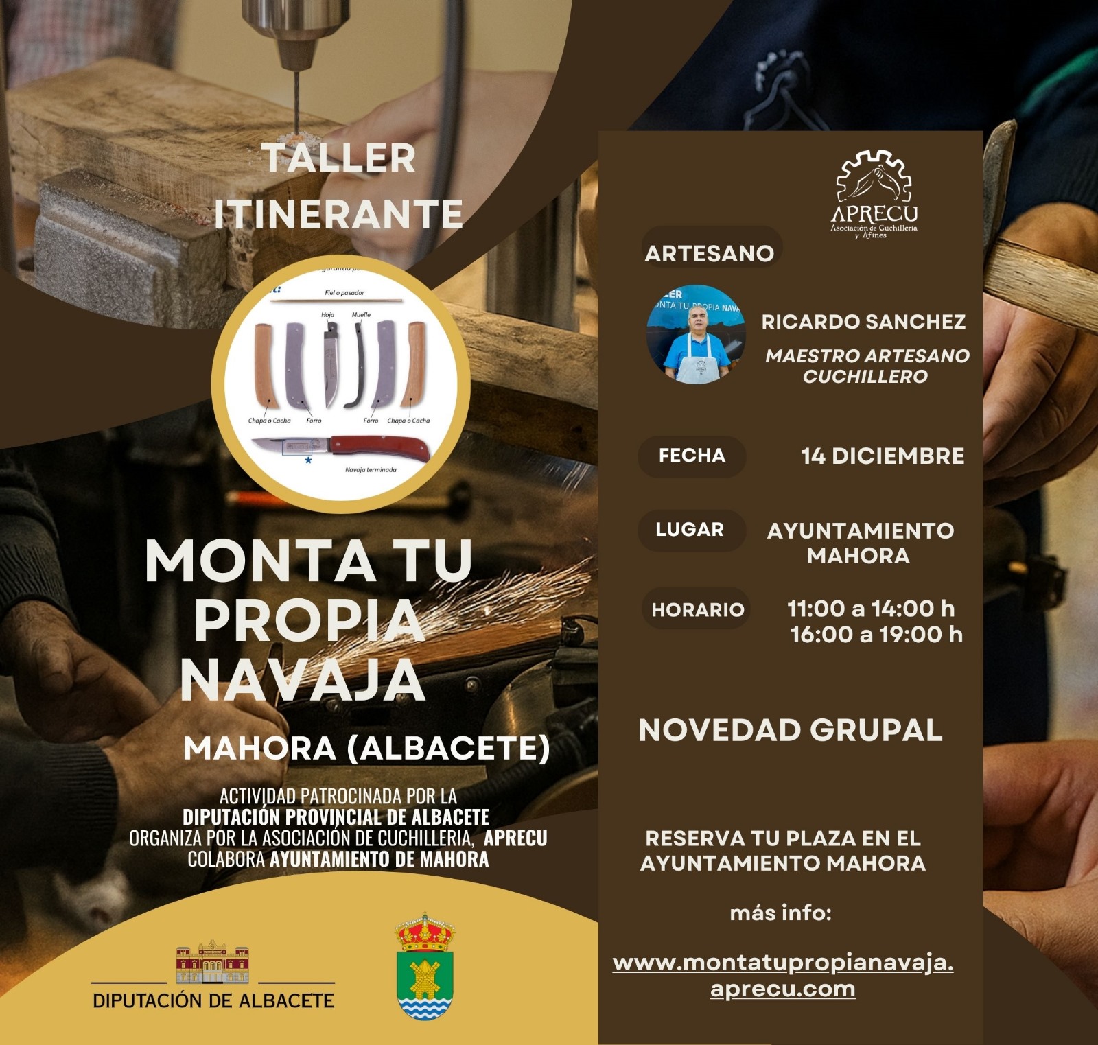 TALLER ITINERANTEMONTA TU PROPIA NAVAJAFECHA: 14 DE DICIEMBRELUGAR: AYUNTAMIENTO DE MAHORAHORARIO: 11:00 a 14:00 h 16:00 a 19:00 hNOVEDAD GRUPALRESERVA TU PLAZA EN EL AYUNTAMIENTO