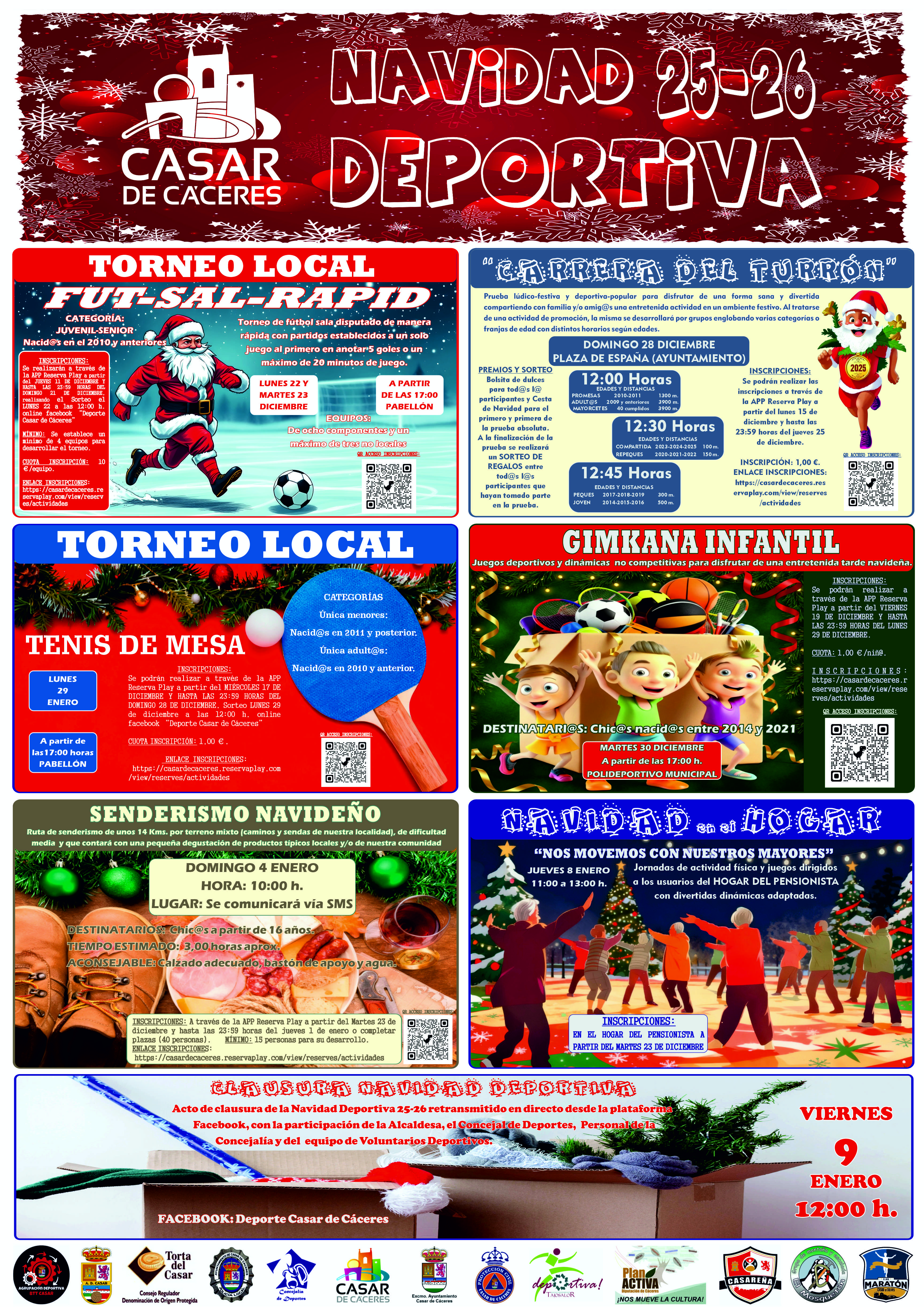 Para ello volveremos a disfrutar de actividades para todos los sectores de población, pensadas y estudiadas todas ellas, con un total de seis actividades, dando el Pistoletazo de salida el próximo 22 de Diciembre con una esa nueva y renovada versión del Torneo de Fútbol Sala, que tanto éxito tuvo la edición anterior, como es el Fut-Sal-Rapid, para continuar con la Carrera del Turrón, por supuesto a mediodía en nuestra Plaza del Ayuntamiento, el tradicional Torneo de Tenis de Mesa, muy demandado edición tras edición, para los más peques la tradicional Gimkana Infantil “Especial Navidad”, también como novedad en esta edición, el Senderismo Navideño, donde además de andar, disfrutaremos de una pequeña degustación de productos típicos y como no, nuestra cita Navideña con Nuestros Mayores, donde llevaremos a cabo unos juegos y dinámicas en el Hogar del Pensionista!!! Y todo ello, con el objetivo de cerrar este 2025 y comenzar el 2026 aprovechando el parón escolar, federativo y vacacional ocupando el tiempo libre de una manera sana y divertida.