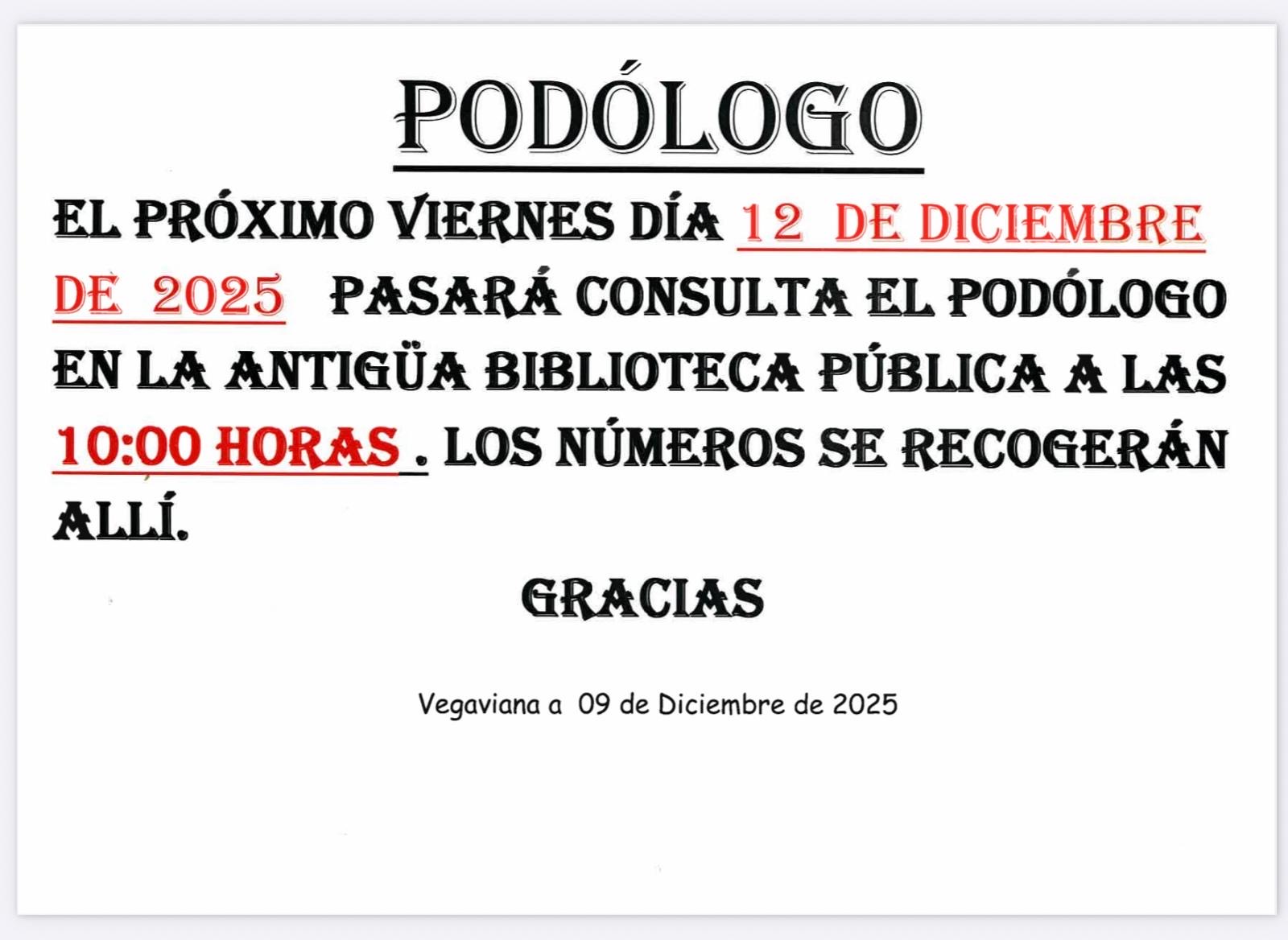 Podólogo. Próximo viernes día 12 de diciembre. A las 10:00 H.