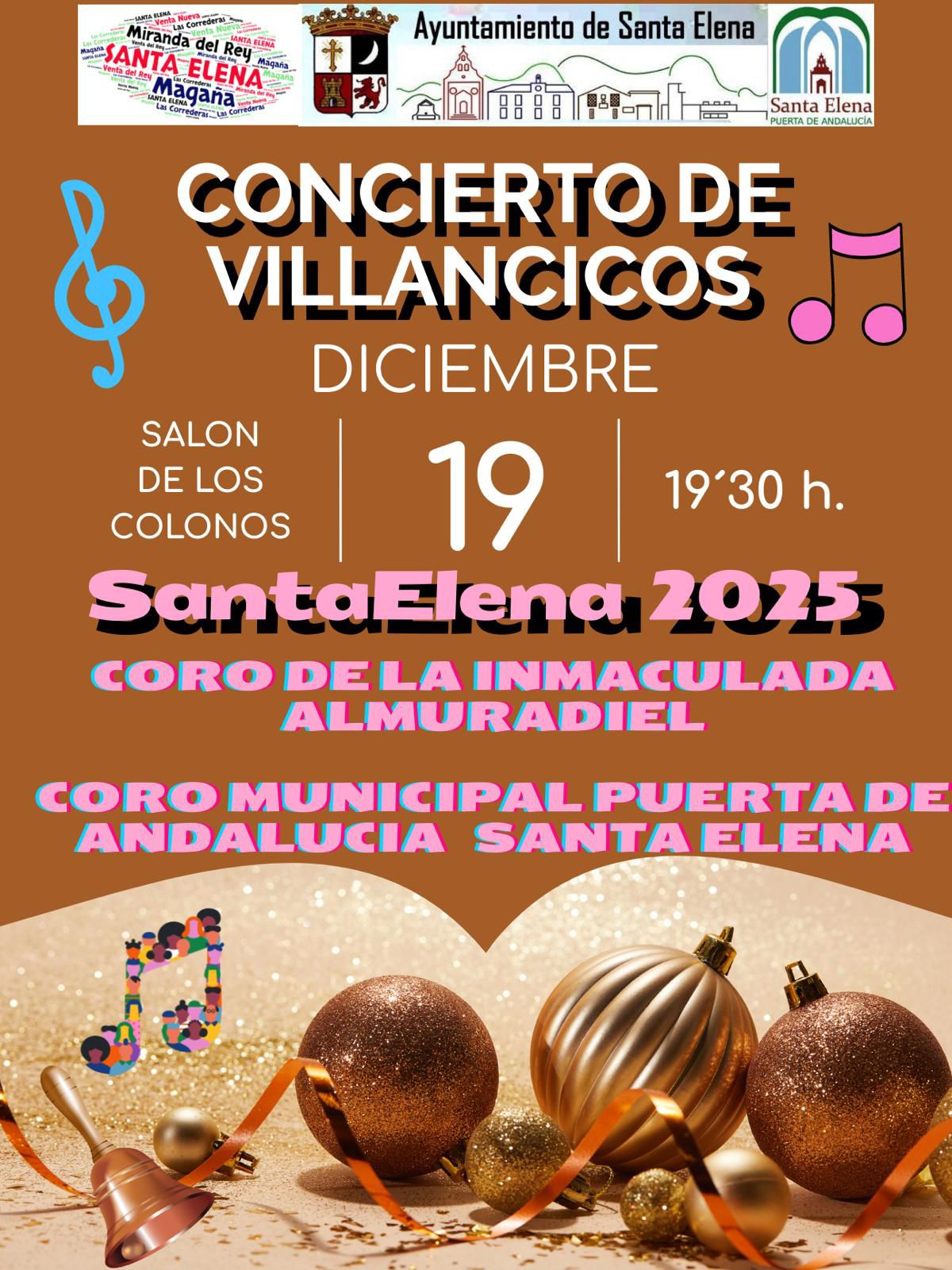 Tradicional Concierto de Villancicos con los Coros de La Inmaculada de Almuradiel y el Coro Municipal Puerta de Andalucía de Santa Elena. El Viernes19 de Diciembre a las 19:30h. en el Salón de los Colonos.