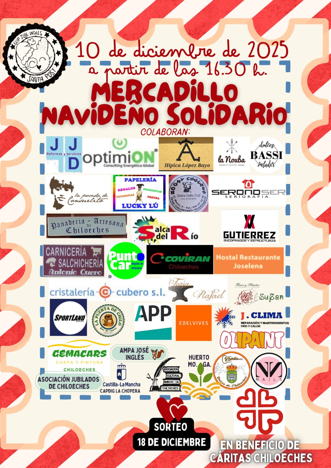 La solidaridad se adueñará de Chiloeches este miércoles con la celebración de un gran mercadillo navideño solidario organizado por el CEIP José Inglés en colaboración con el Ayuntamiento, diversas empresas y asociaciones locales, cuyos fondos obtenidos irán destinados a Cáritas Chiloeches.