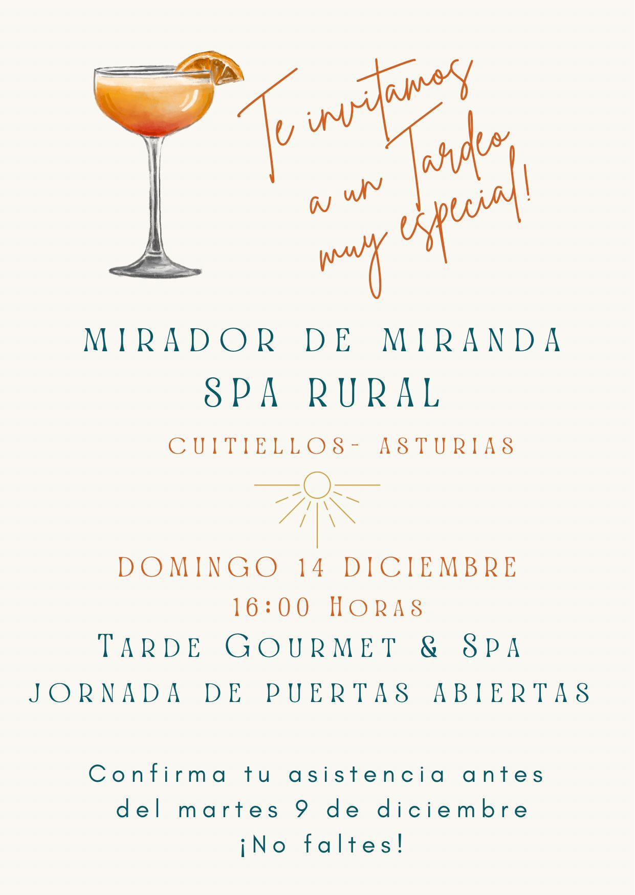 Compartimos la invitación para participar en la jornada de puertas abiertas del Mirador de Miranda Spa Rural, que se celebrará el próximo domingo día 14 de diciembre, y que consistirá en un bufet "Self Service" informal para desconectar e intercambiar ideas.