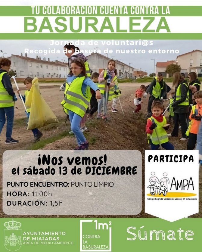 El Ayuntamiento de Miajadas, desde el área de Medio Ambiente, vuelve a organizar una nueva jornada de recogida de residuos bajo el lema «MIAJADAS, contigo + limpia», y se desarrollará este sábado, 13 de diciembre. El objetivo de esta recogida de residuos es concienciar y movilizar a la ciudadanía para mantener los espacios naturales liberados de BASURALEZA.