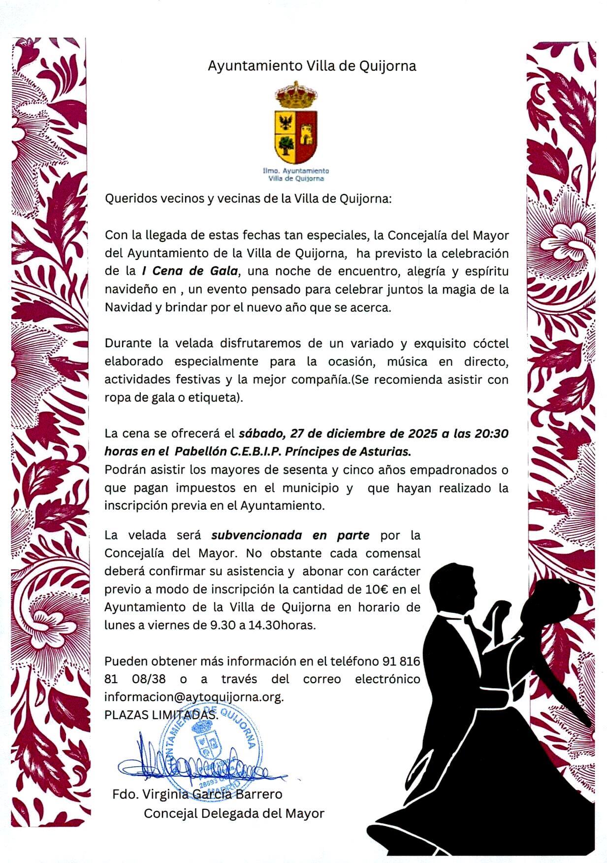 Con la llegada de estas fechas tan especiales, la Concejalía del Mayor del Ayuntamiento de la Villa de Quijorna, ha previsto la celebración de la I Cena de Gala, una noche de encuentro, alegría y espíritu navideño en , un evento pensado para celebrar juntos la magia de la Navidad y brindar por el nuevo año que se acerca.