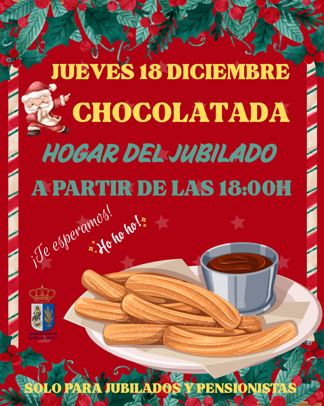 Desde la Concejalía de Mayores y Asuntos Sociales, te invitamos a una deliciosa chocolatada destinada exclusivamente a las personas jubiladas y pensionistas del Hogar del Jubilado. Será el jueves 18 de diciembre, a partir de las 18:00 h.