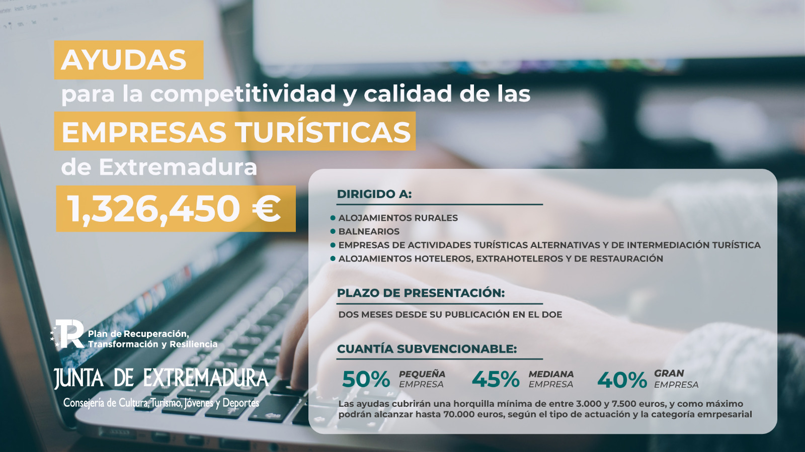 La Junta de Extremadura informa de la convocatoria de AYUDAS para la competitividad y la mejora de la calidad de las empresas turísticas de Extremadura, dentro del Plan de Recuperación, Transformación y Resiliencia.