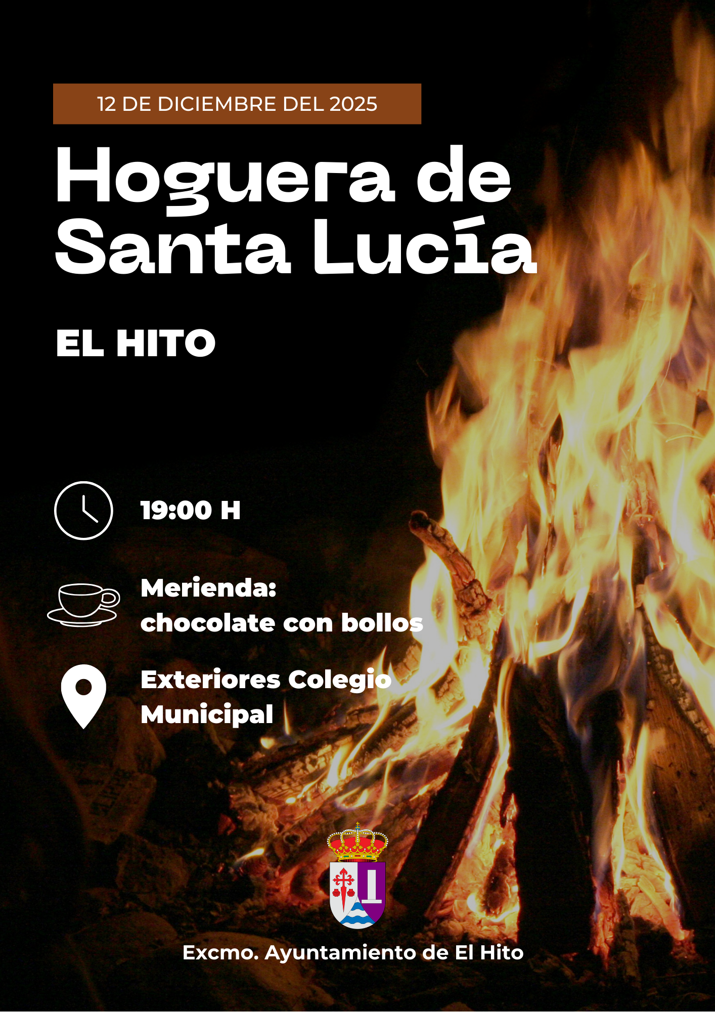 El próximo viernes 12 de diciembre a las 19:00H, en los exteriores del Colegio Municipal, os invitamos a merendar un rico chocolate con bollos al calor de la hoguera en honor a Santa Lucía.¡Te esperamos!