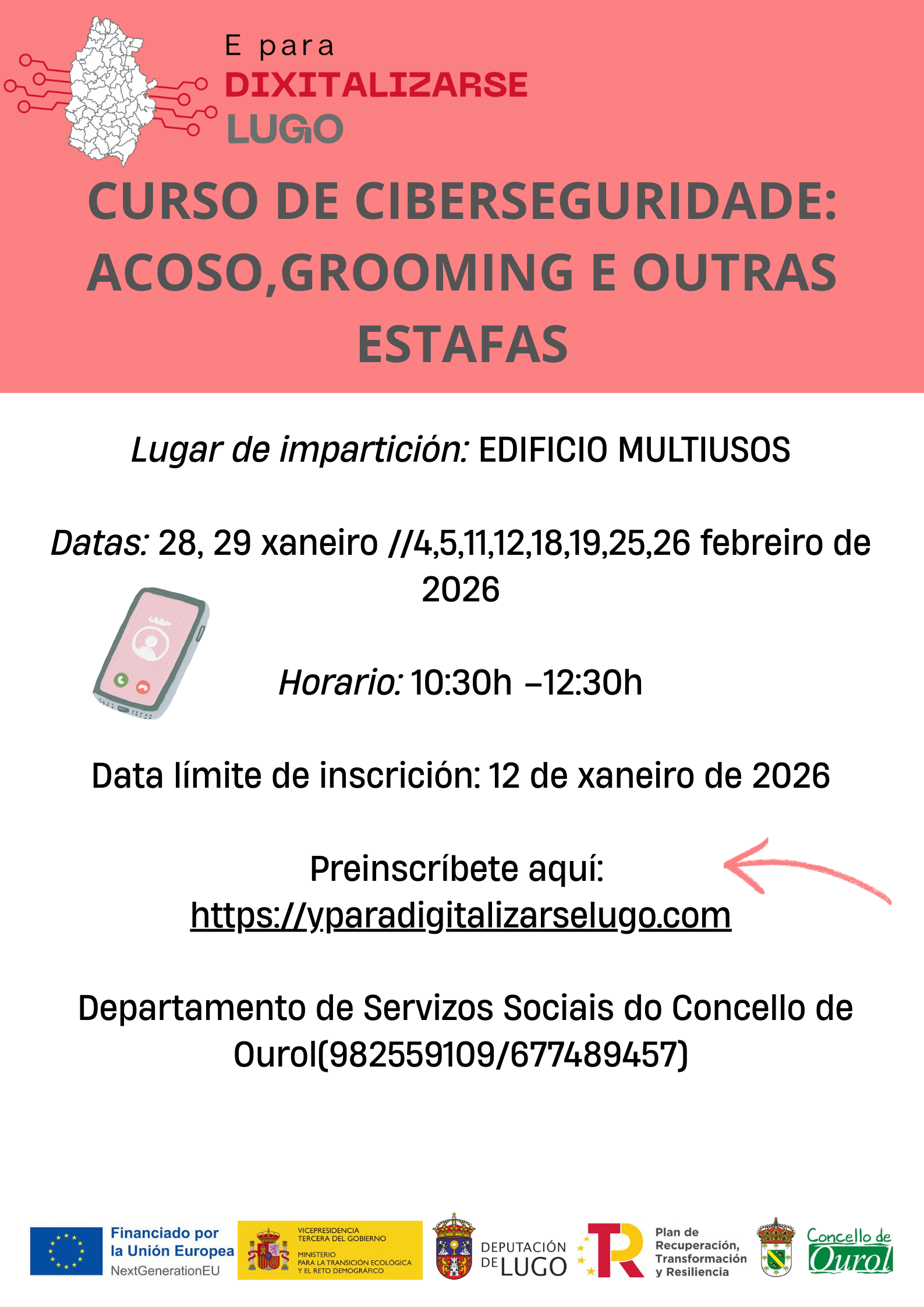 Xa está aberta a preinscrición para a acción formativa "CIBERSEGURIDADE: ACOSO, GROOMING E OUTRAS ESTAFAS" dentro do programa "PARA DIXITALIZARSE LUGO"