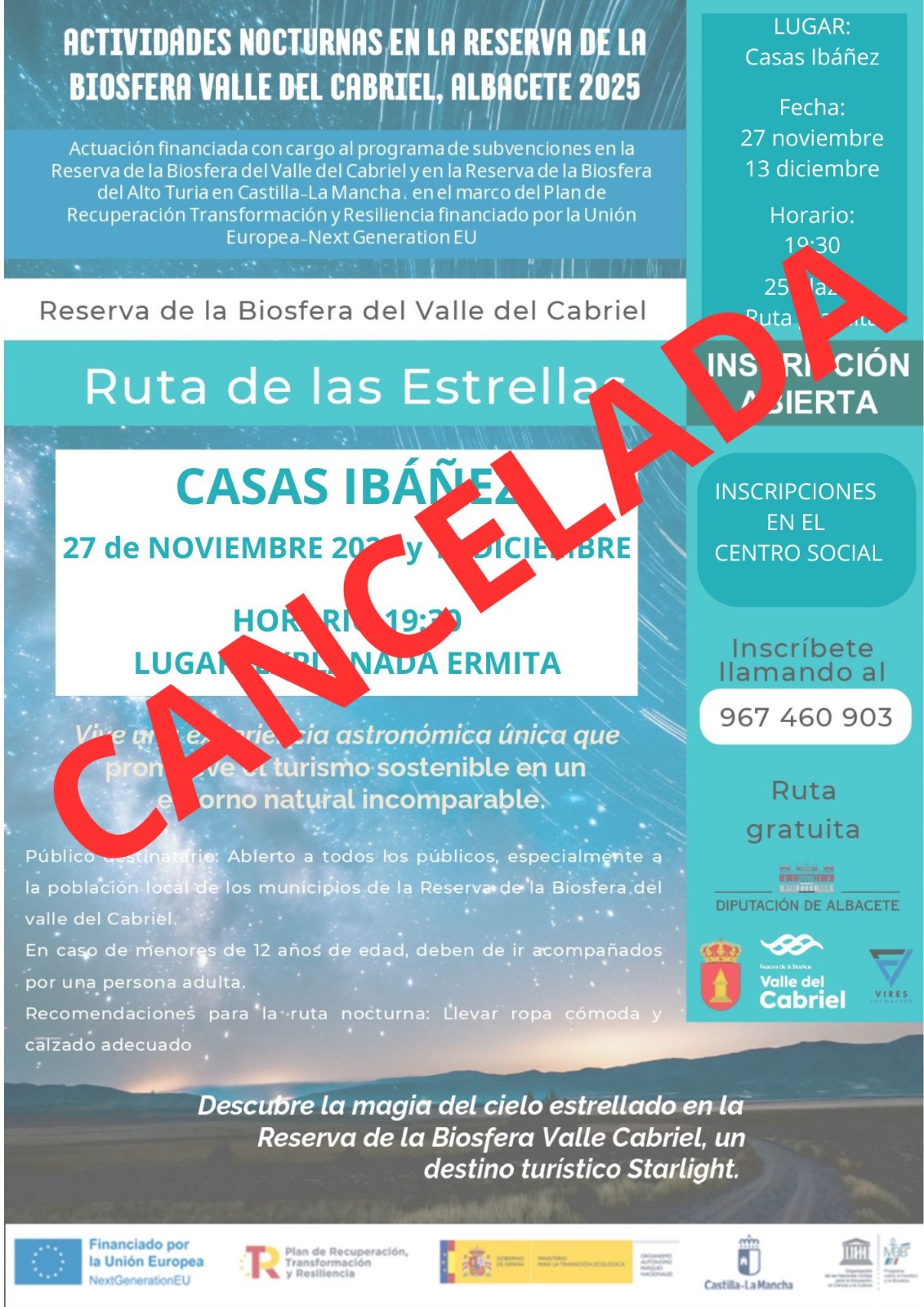 Debido a la previsión meteorológica adversa prevista para el próximo sábado día 13 que va a impedir la observación🔭 de estrellas✨, queda 🚫CANCELADA🚫 la ruta.