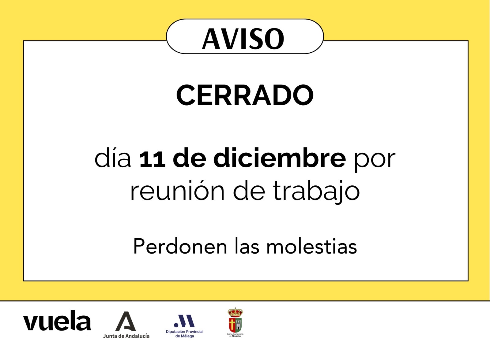 El Punto Vuela (Guadalinfo) permanecerá cerrado hoy, 11 de diciembre, debido a una reunión de trabajo. Disculpen las molestias. El servicio volverá a estar disponible en su horario habitual mañana. ¡Gracias por su comprensión! 💛