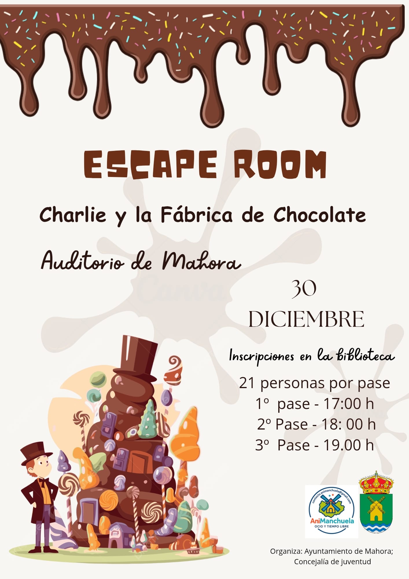 ESCAPE ROOMCharlie y la Fábrica de ChocolateAuditorio Municipal MahoraDia: 30 de DiciembreInscripciones en la Biblioteca 21 personas por pase. Edad: a partir de 7 años1º pase- 17:00 h2º pase- 18:00 h3º pase- 19:00 h