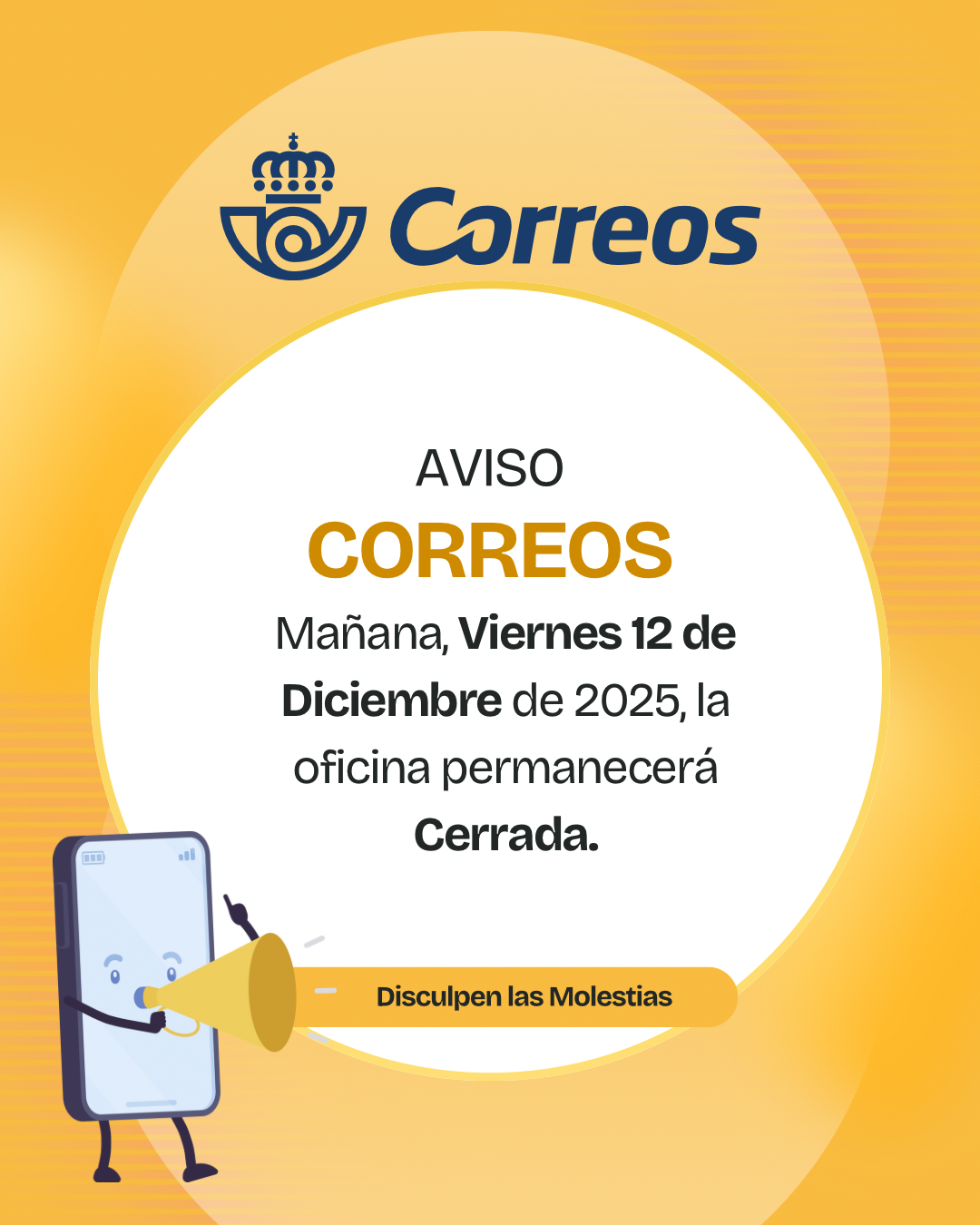 📣 Información que nos hacen llegar – CORREOS 📣 Les comunicamos que mañana, viernes 12 de diciembre de 2025, la oficina de Correos permanecerá cerrada. ℹ️ Disculpen las molestias. Agradecemos su comprensión.