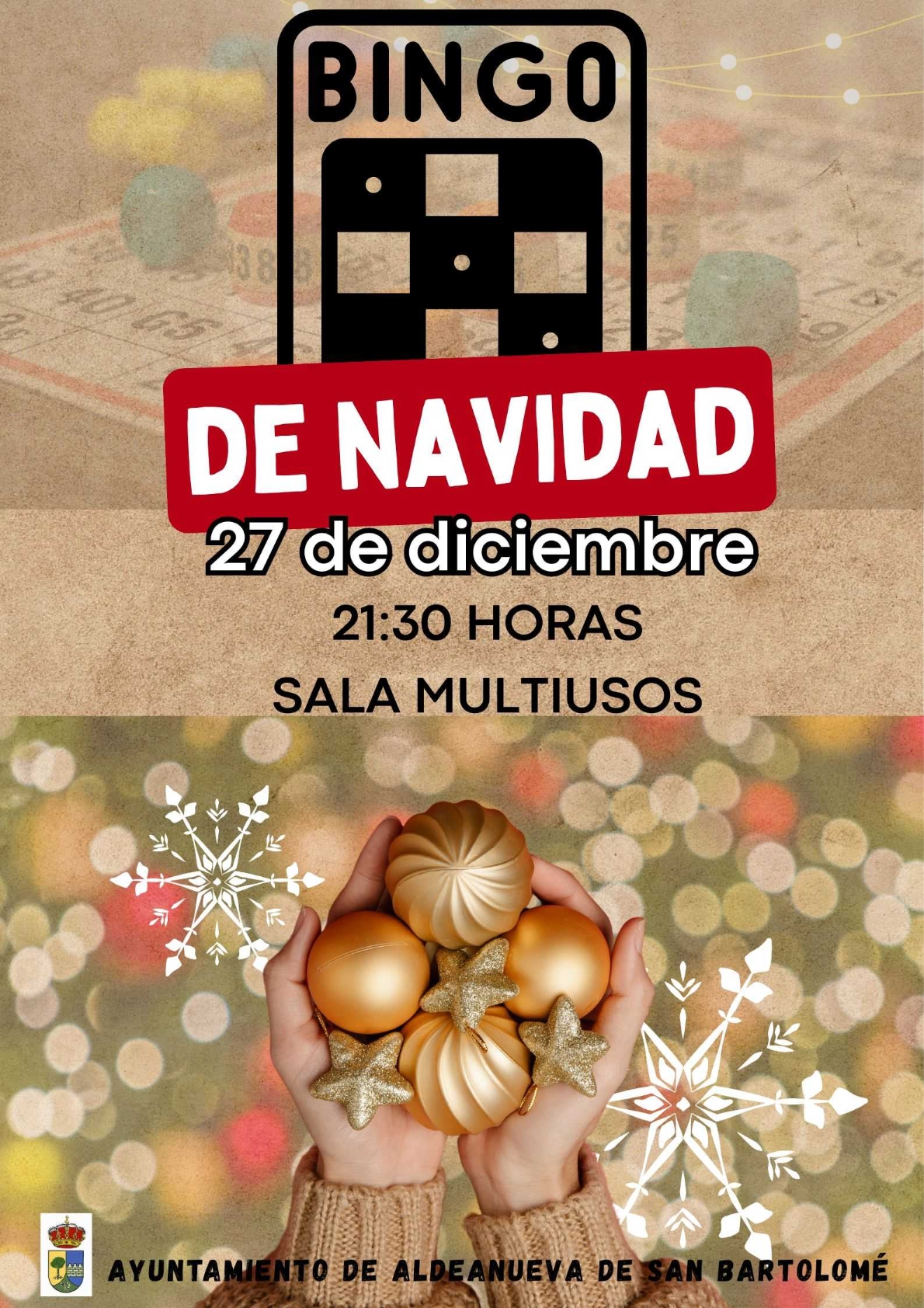 SÁBADO 27 DICIEMBRESALA MULTIUSOS21:30 HORAS¡¡VEN A PROBAR TU SUERTE EN EL TRADICIONAL BINGO NAVIDEÑO!! Bebidas, música, buen ambiente y muchos premios!!!