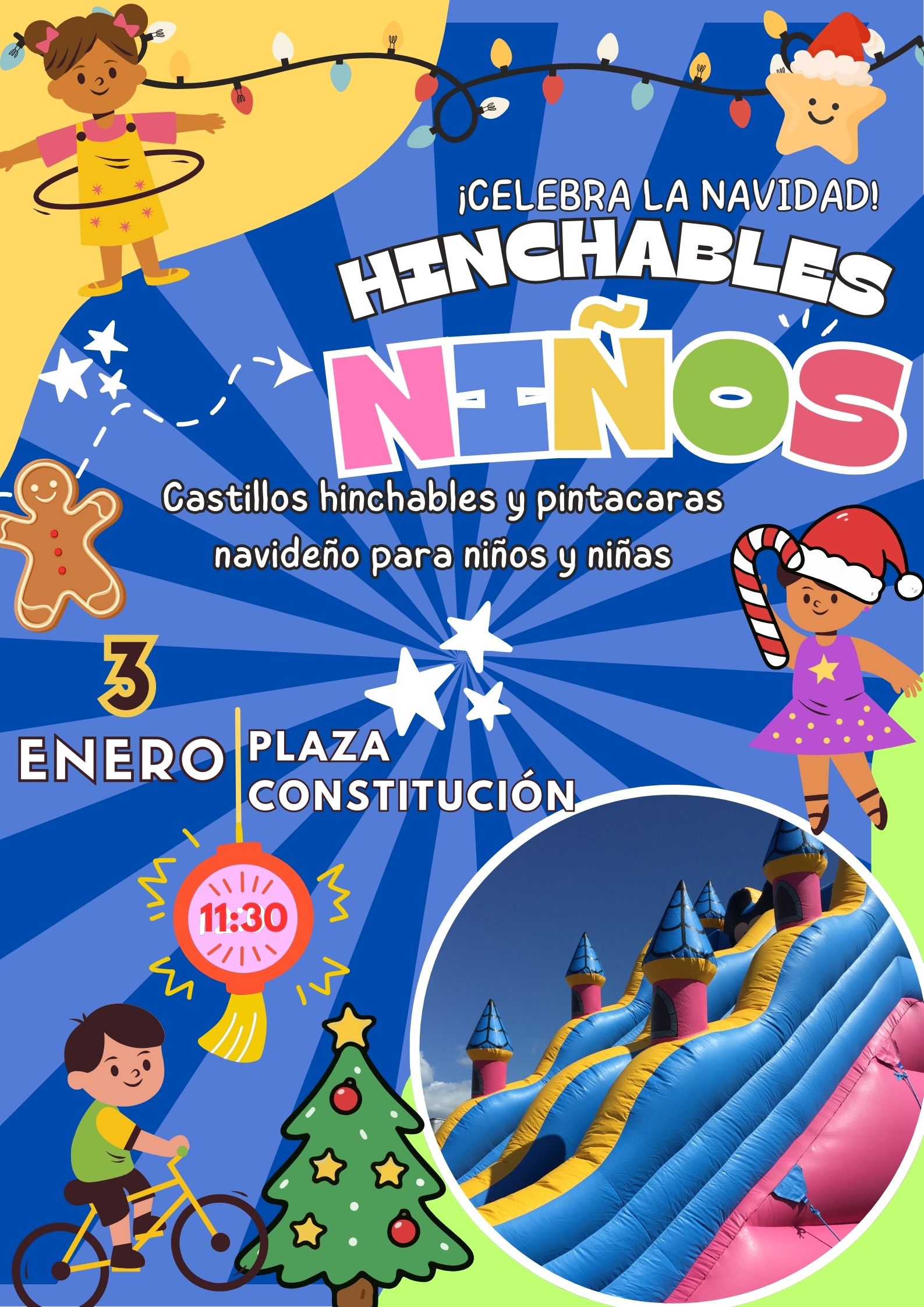El 3 de ENERO en la Plaza Constitución HINCHABLES Y PINTACARAS a partir de las 11:30 horas para todos los niños y niñas de 4 a 10 años.