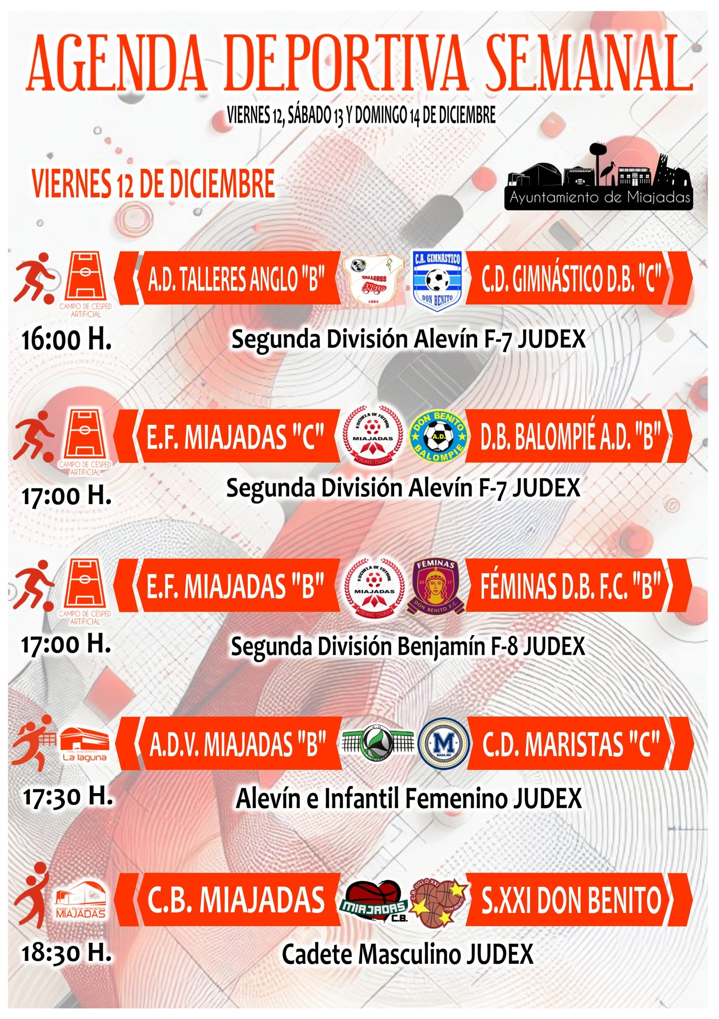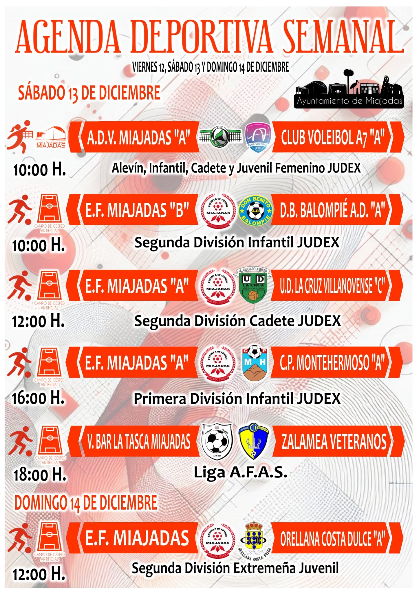 Como siempre, os adjuntamos relación de encuentros deportivos a disputarse en Miajadas las jornadas del viernes al domingo, 12, 13 y 14 de diciembre.