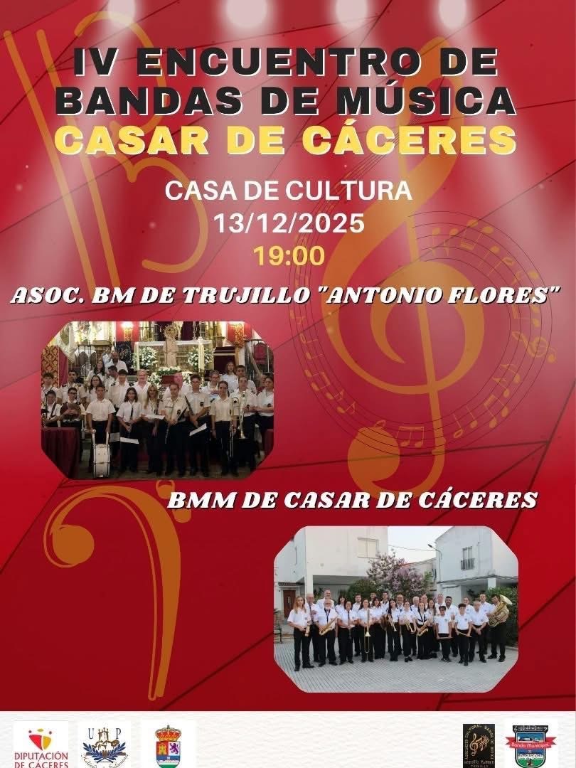 🎶 IV Encuentro de Bandas de Música de Casar de Cáceres organizado por la Banda Casar de Cáceres.📍Casa de Cultura ⏰ 19:00H📅 Sábado 13 de diciembre Os esperamos 👏🏼#casardecaceres