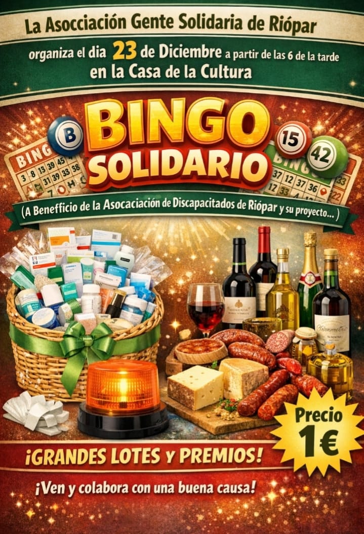A continuación, tendrá lugar un bingo solidario, organizado por la Asociación Gente Solidaria, a favor de la de la Asociación de Familias de Discapacitados de Riópar.