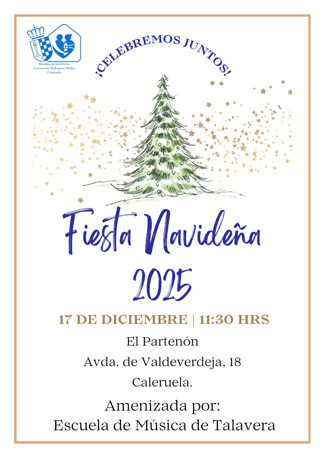 La celebración tendrá lugar en el Partenón y estará amenizada por la Escuela de Música de Talavera de la Reina. Les invitamos a acompañar a las personas residentes y a sus familias para compartir un rato agradable.