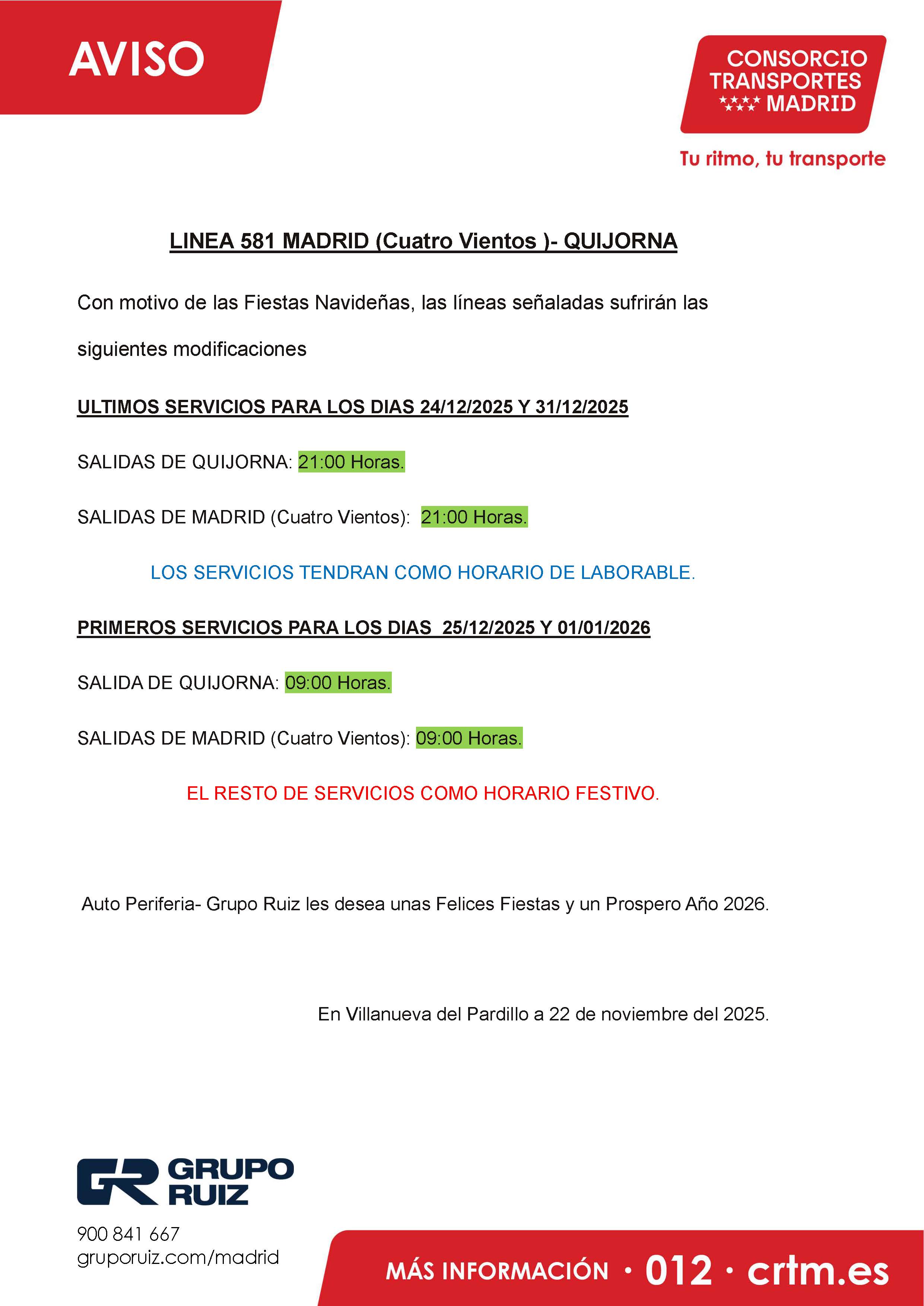 🔹🔹🔹IMPORTANTE🚌🔹🔹🔹Con motivo de las Fiestas Navideñas🎄,la línea 581 MADRID(Cuatro Vientos)- Quijorna sufrirá las siguientes modificaciones.81