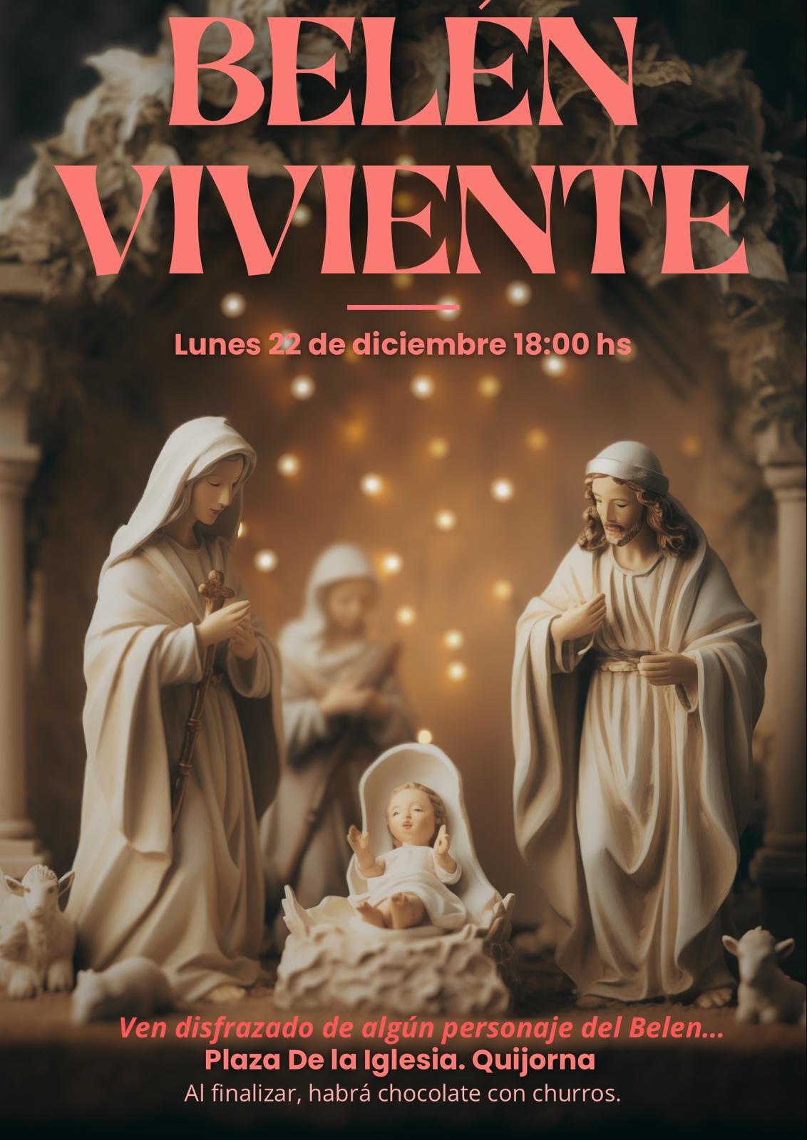 Representación Belén viviente realizado por los feligreses y colaboradores de la Parroquia San Juan Evangelista de Quijorna.Al finalizar se ofrecerá chocolate con churros. FECHA: lunes,22 de dic. HORA: 18.00 horas. LUGAR: Plaza de la Iglesia